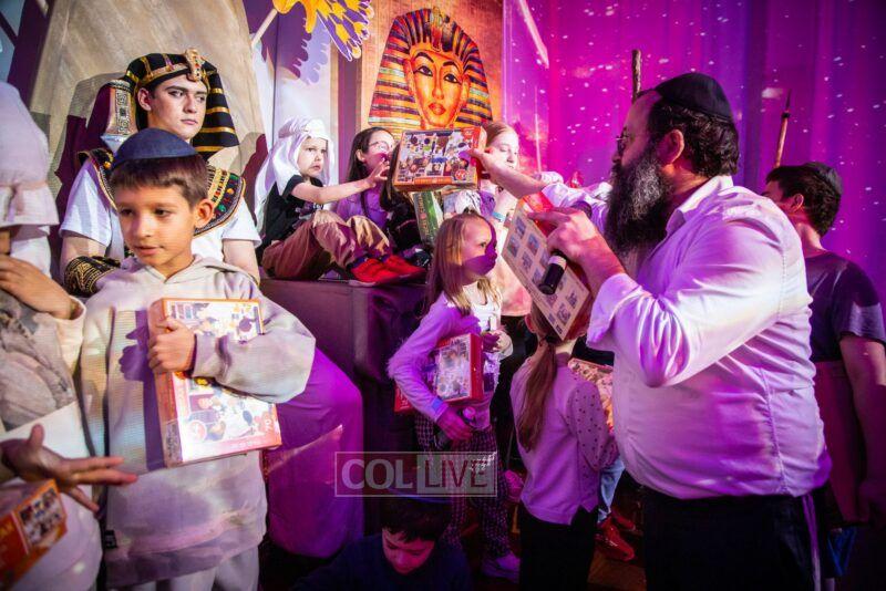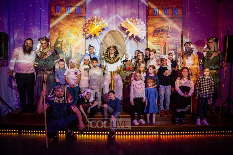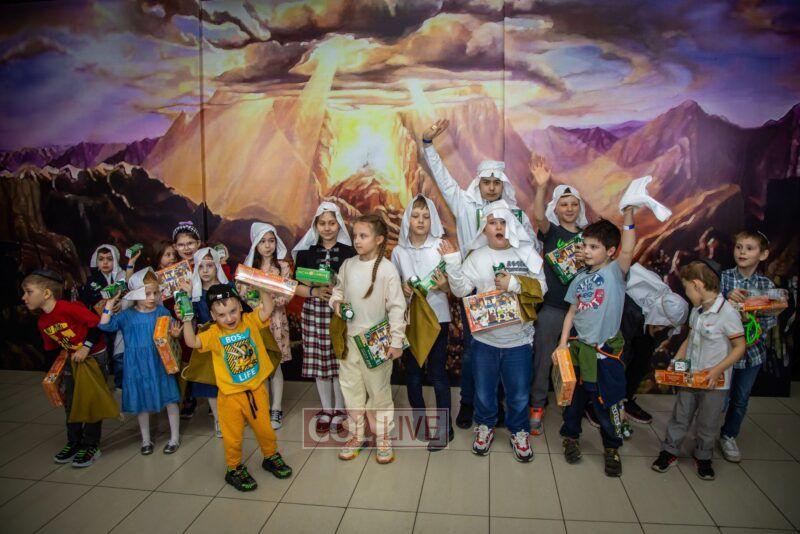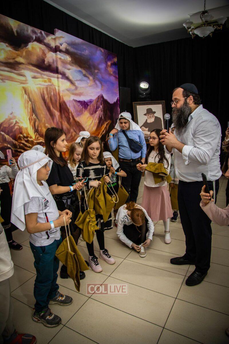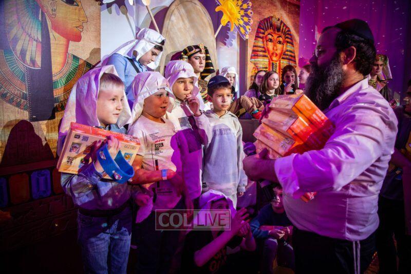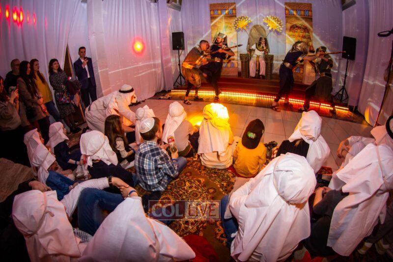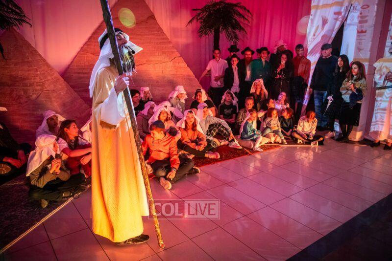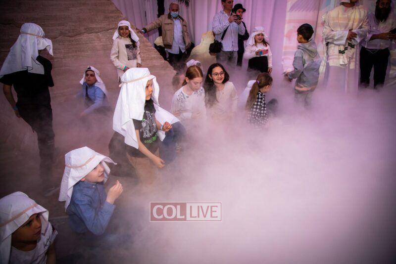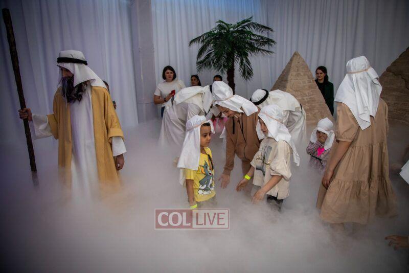 After the last plague, each child was given a sack with matza, and they witnessed the miracle of the splitting of the sea, collecting jewels while being sprayed with water as they made their way towards Har Sinai. The interactive program ended with lively dancing with tambourines and music.