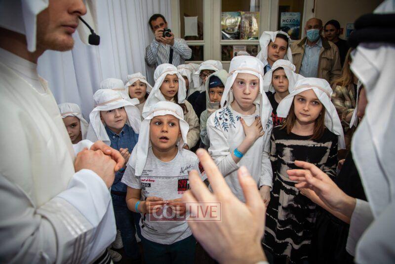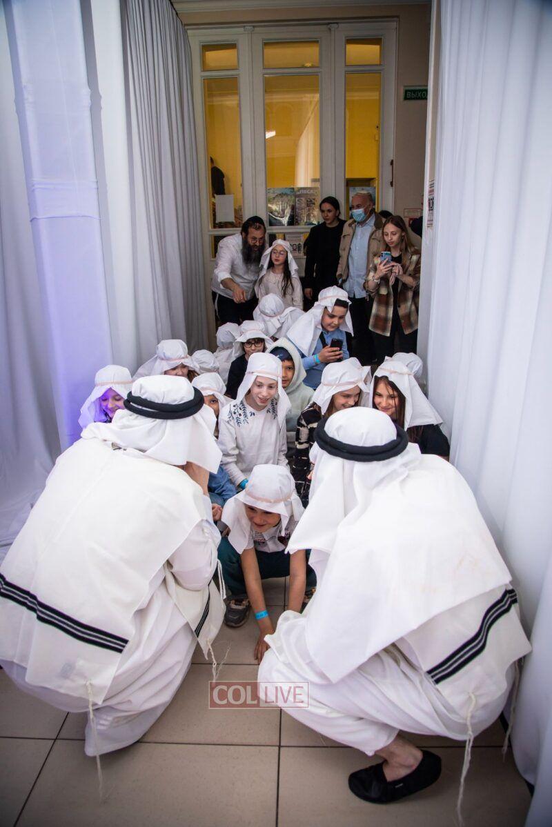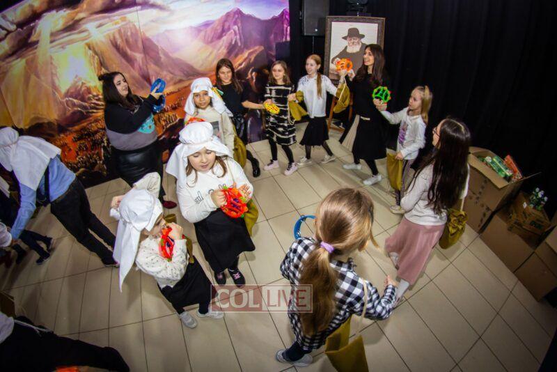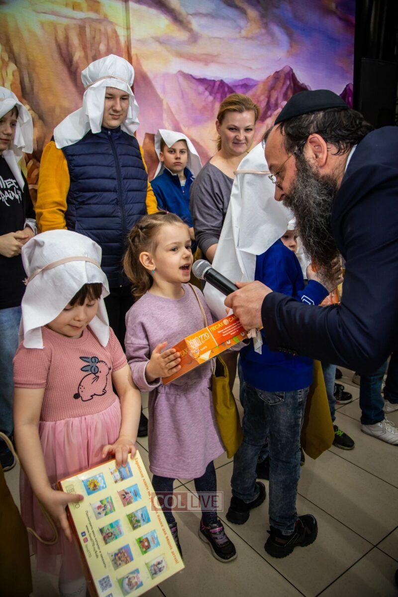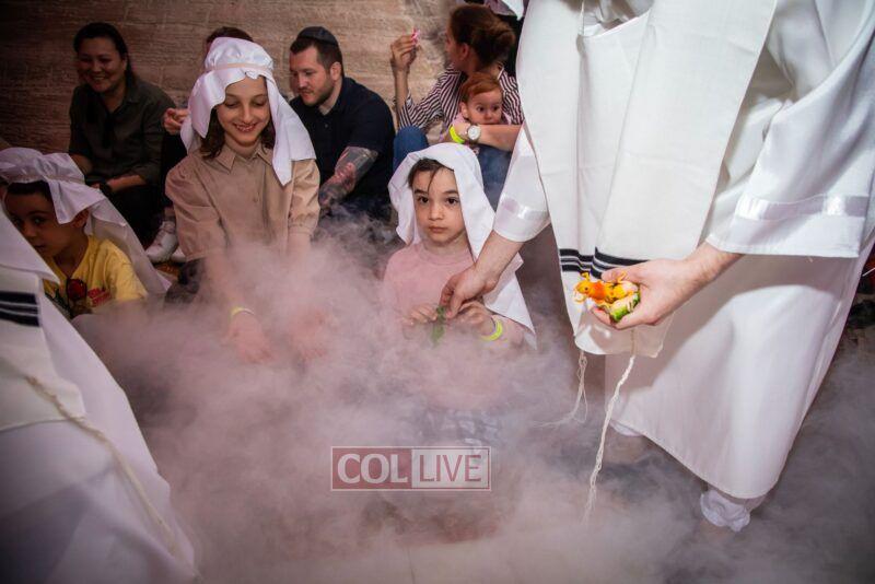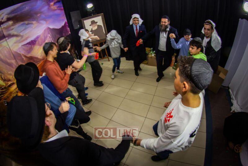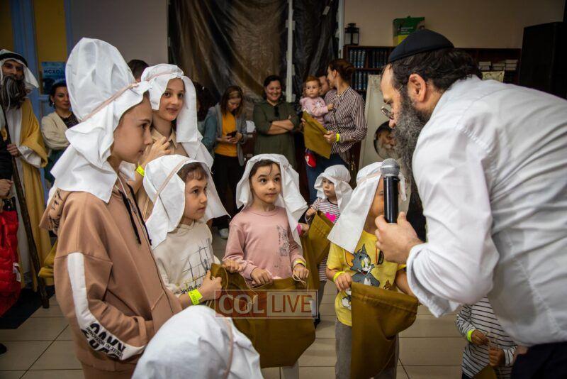 After the last plague, each child was given a sack with matza, and they witnessed the miracle of the splitting of the sea, collecting jewels while being sprayed with water as they made their way towards Har Sinai. The interactive program ended with lively dancing with tambourines and music.