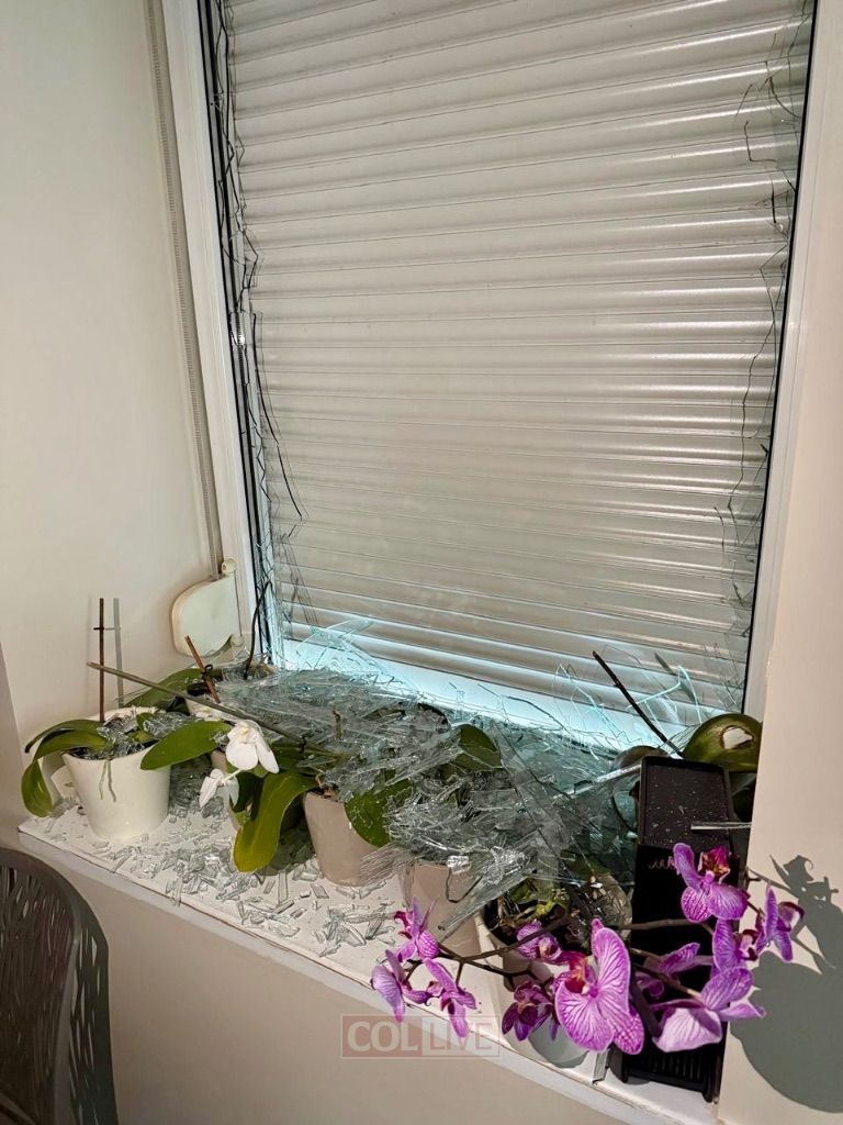 Images from the scene show a small crater near the building, smoke rising from the impact site, and visible damage to surrounding structures. Inside the home, window ledges were covered in broken glass, with household items overturned and personal belongings scattered.