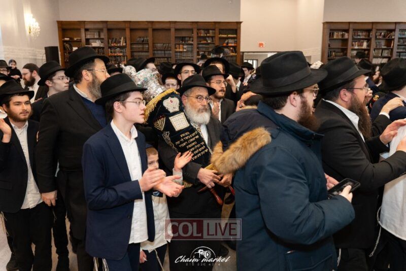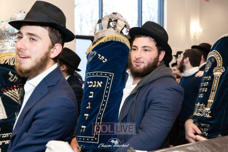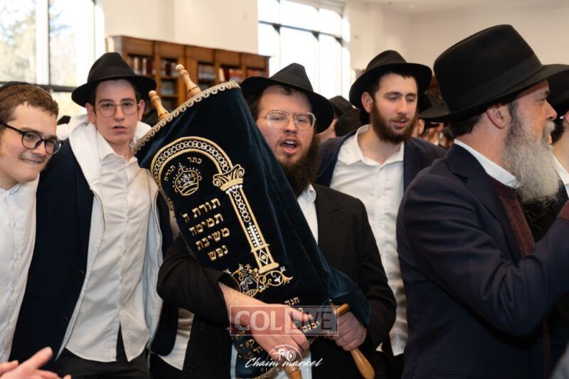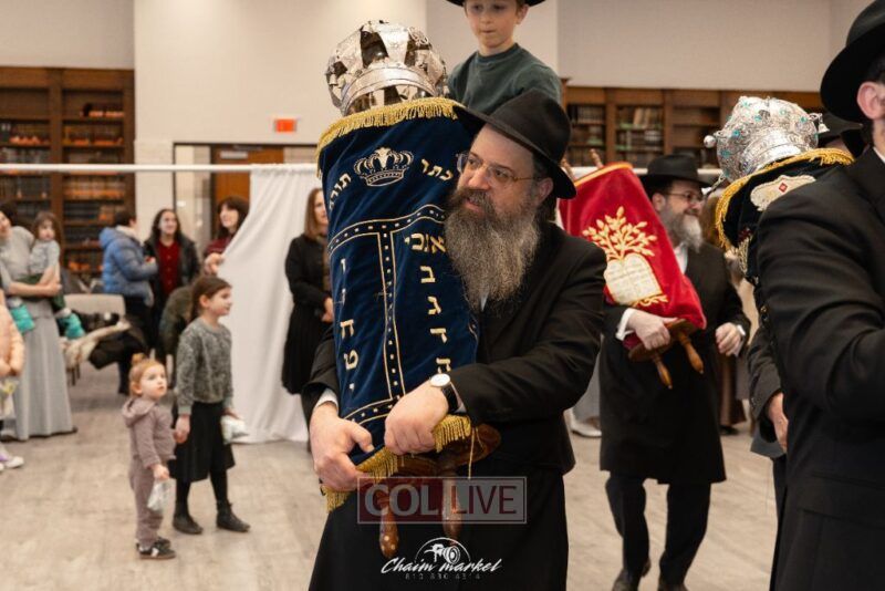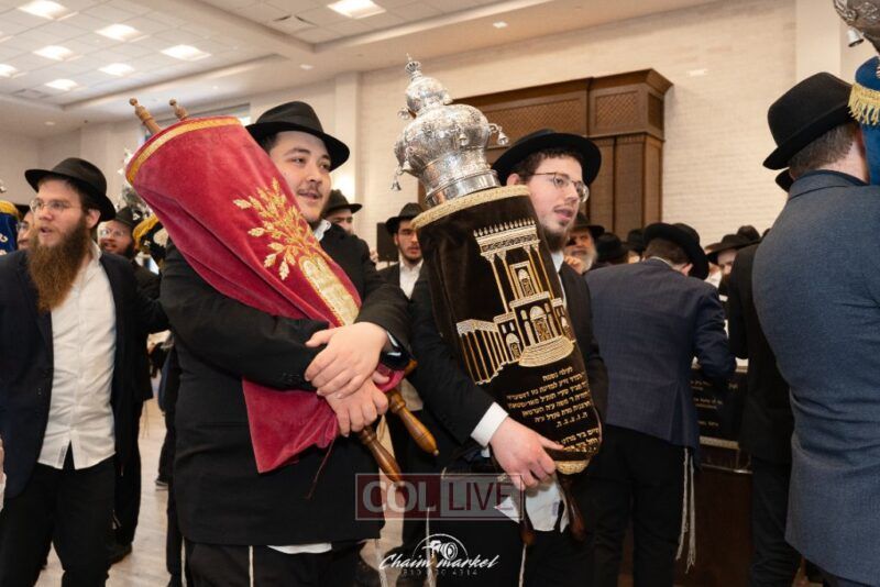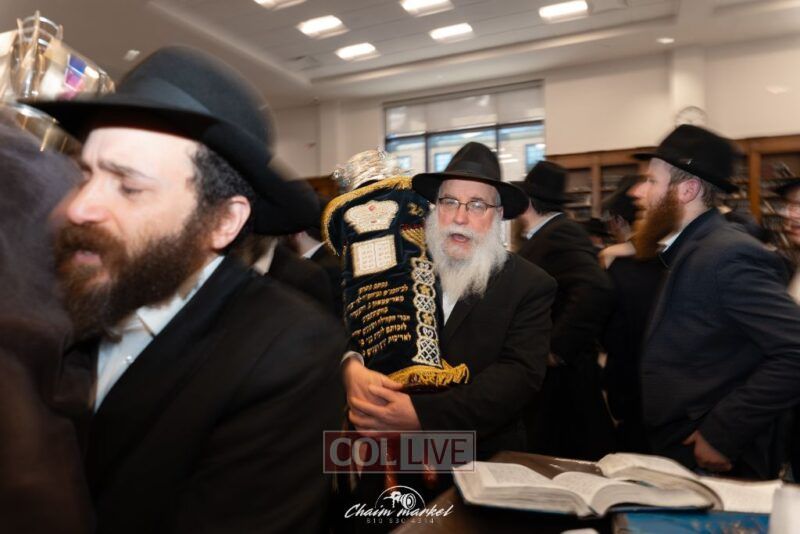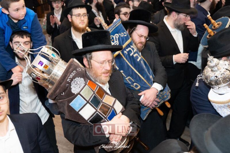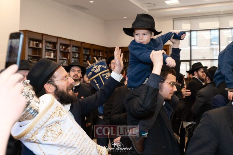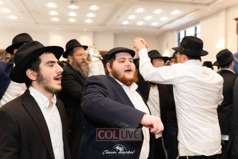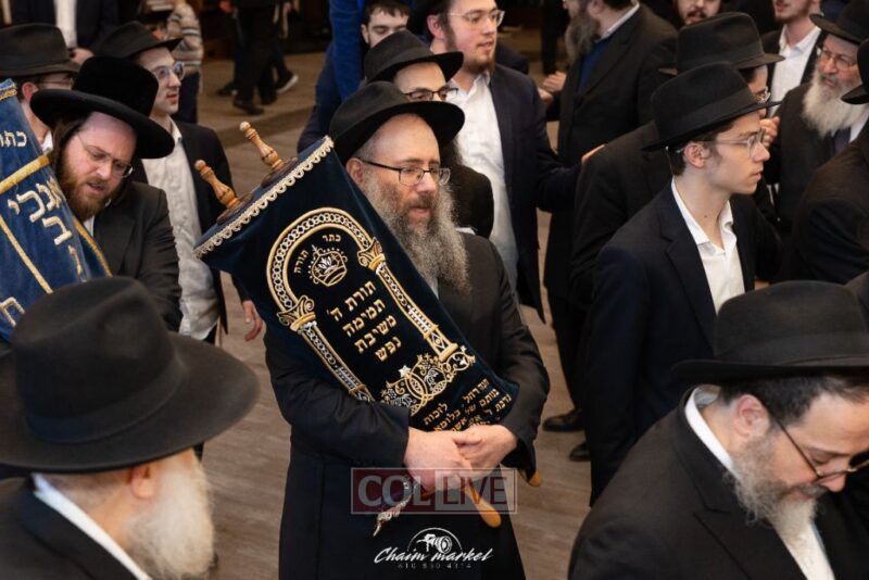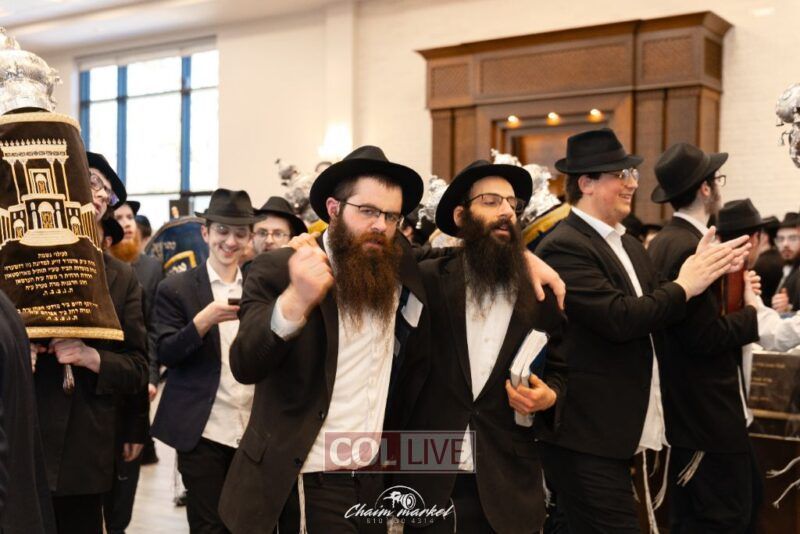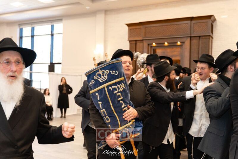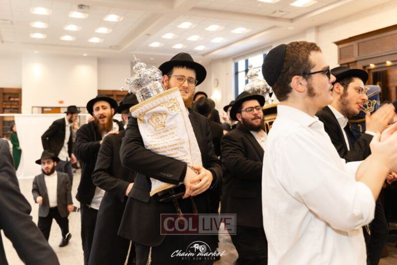 The writing of the final letters began at the Spalter home, followed by a lively parade with music and dancing en route to the Rabbinical College of America, where joyous Hakafos and celebrations continued in the beautiful Tomchei Temimim zal.