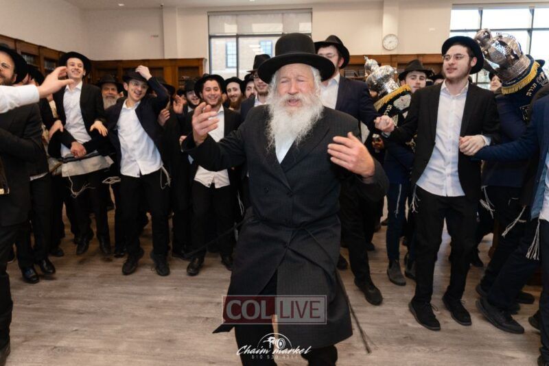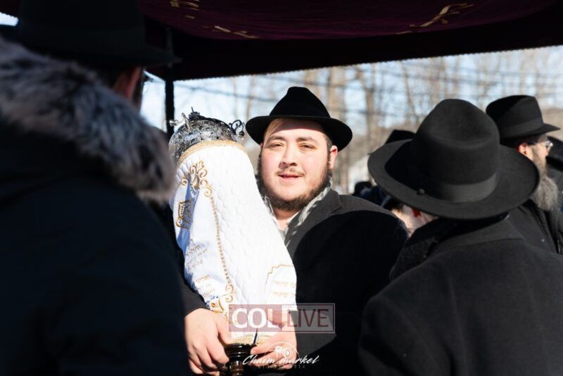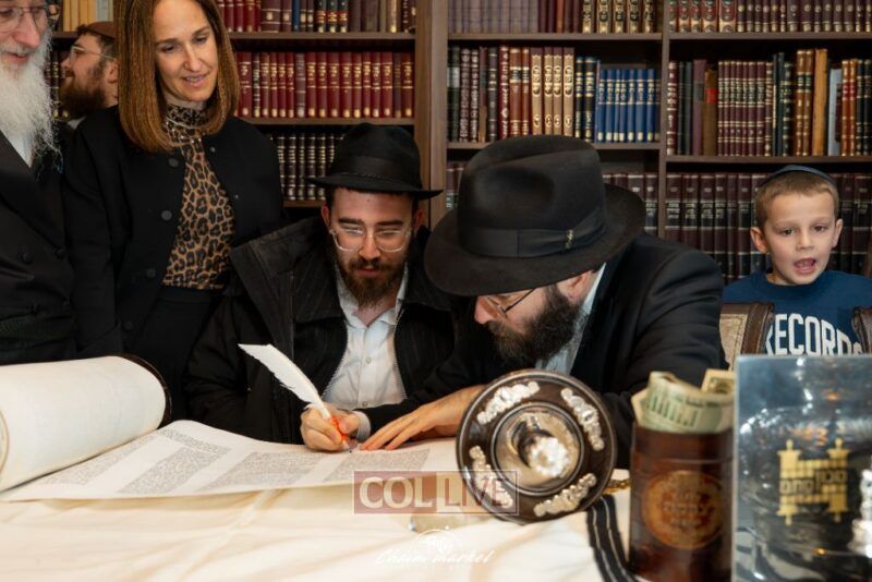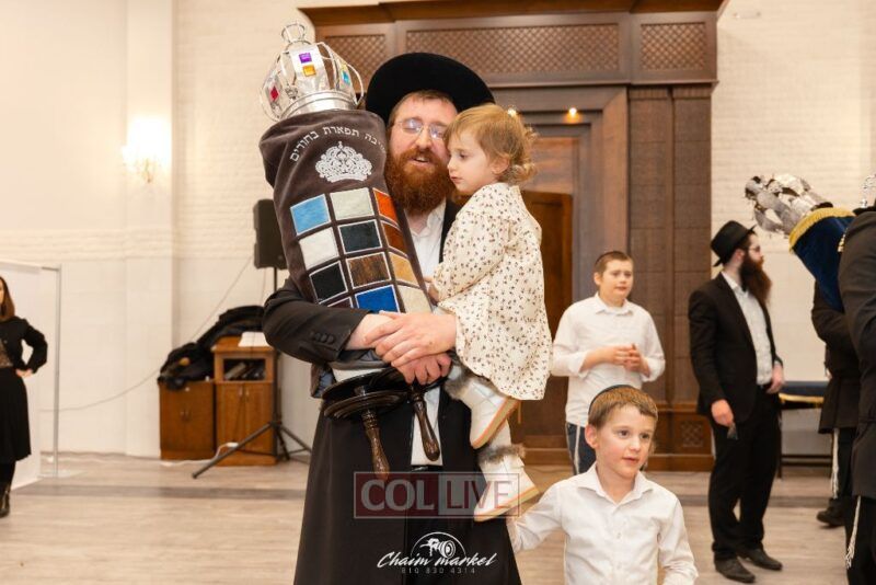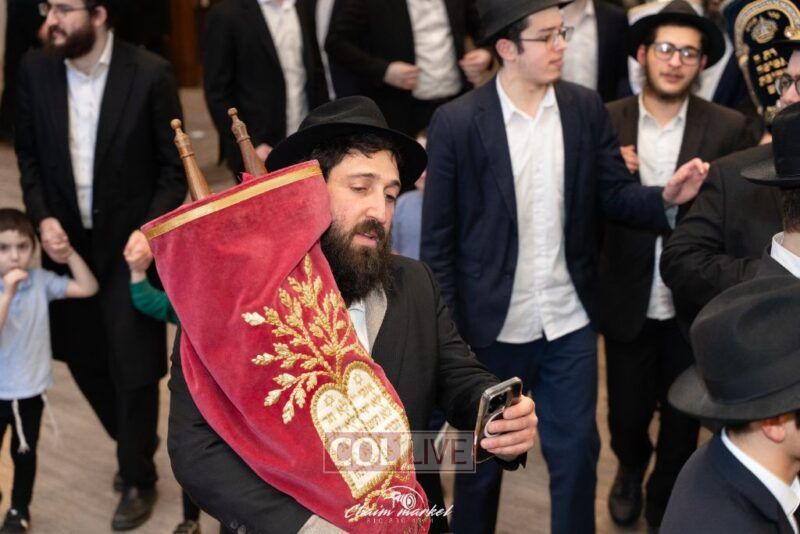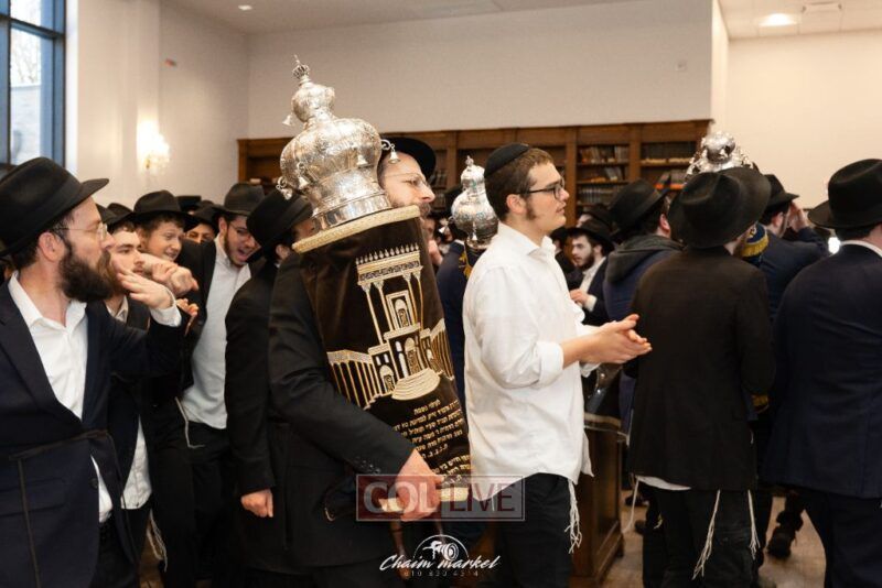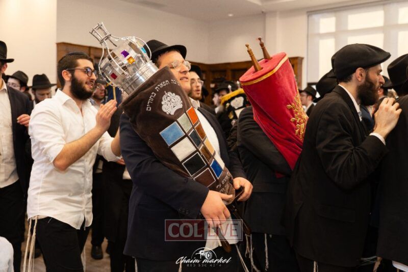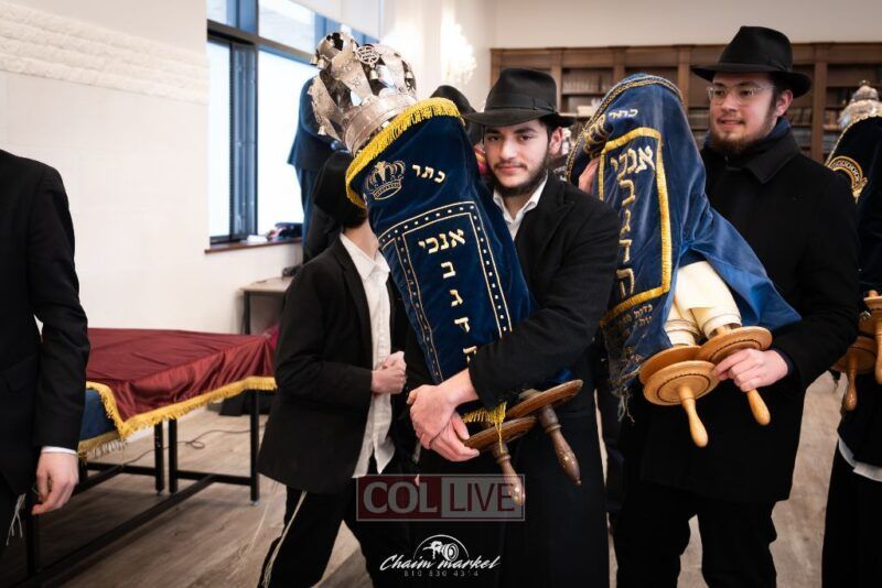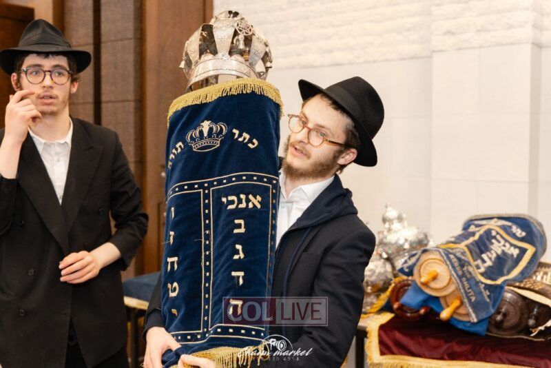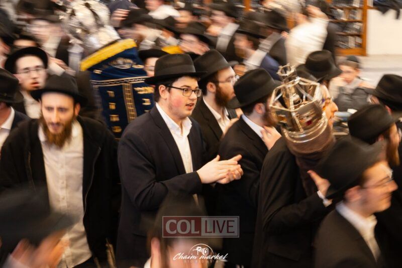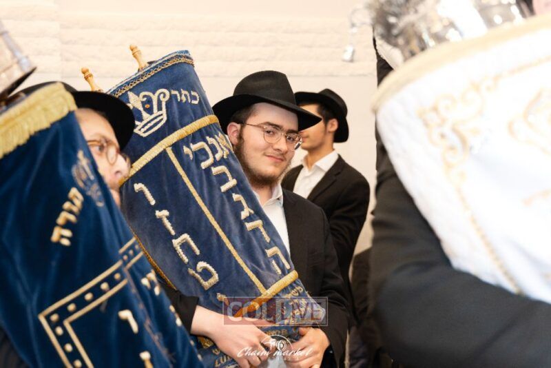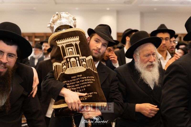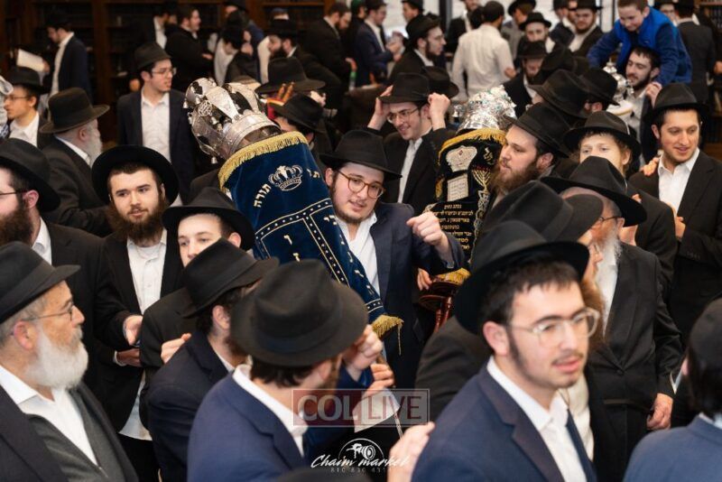 The writing of the final letters began at the Spalter home, followed by a lively parade with music and dancing en route to the Rabbinical College of America, where joyous Hakafos and celebrations continued in the beautiful Tomchei Temimim zal.