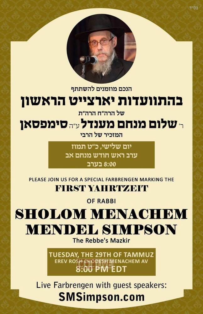 The family of Rabbi Sholom M. Simpson obm, the personal mazkir of the Rebbe, invites all to participate in a very special Farbrengen in honor of his first Yahrtzeit.