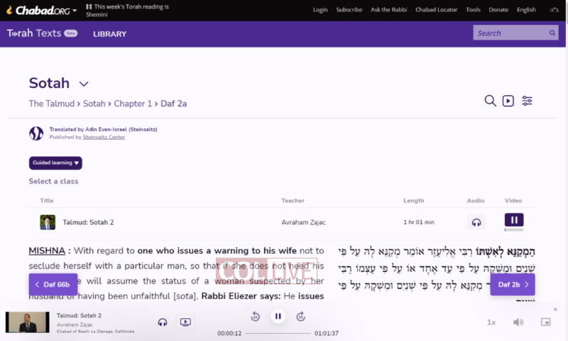 When learning Sotah this year, you can either read the text on your own in the language of your choice (English and/or Hebrew/Aramaic, with Rashi and Tosafot for the seasoned scholars) or you can follow a class by master Talmud teacher, Rabbi Avraham M. Zajac.