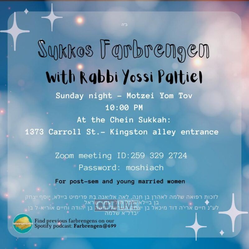 The first Farbrengen will iyH be Sunday night, Motzei Yom Tov, featuring Rabbi Yossi Paltiel and will be hosted by the Cheins on 1373 Carroll street.