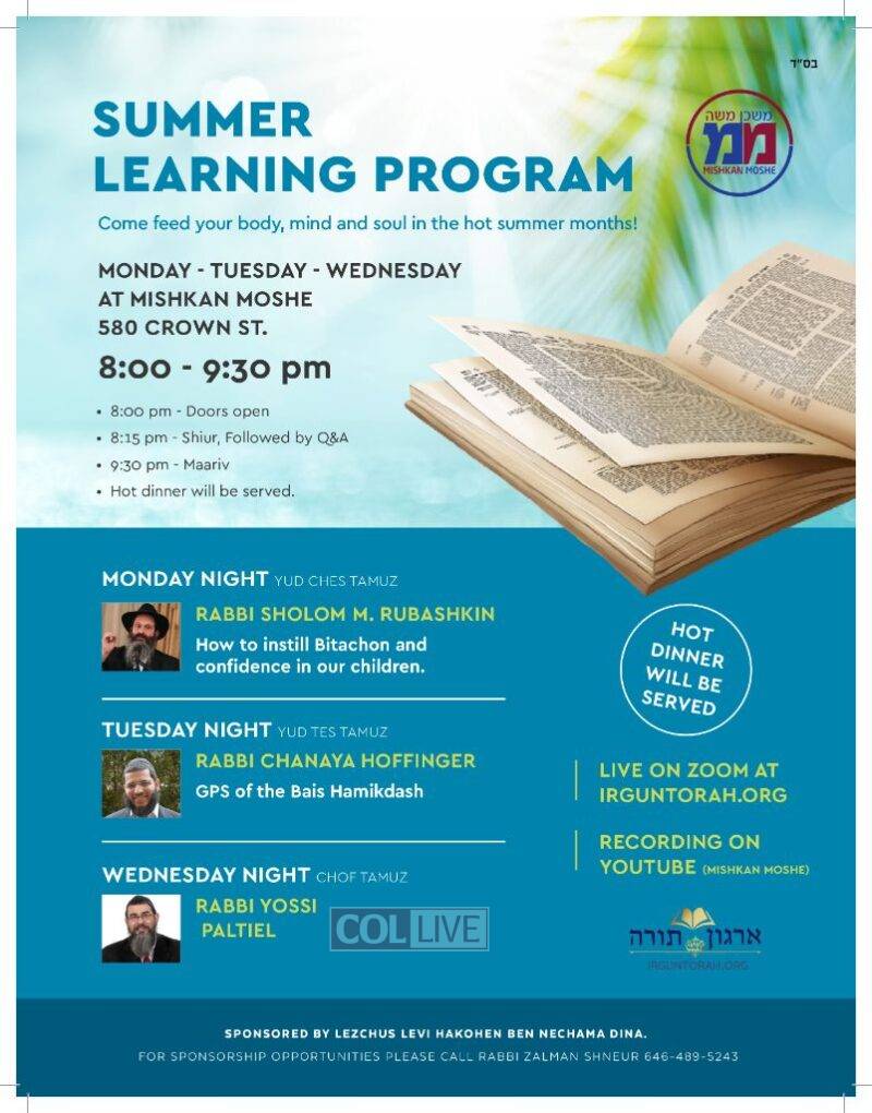 Join on weeknights in the summer months for fascinating, inspiring and entertaining lectures from popular speakers. Shiurim will be Live in Crown heights and online via Zoom.