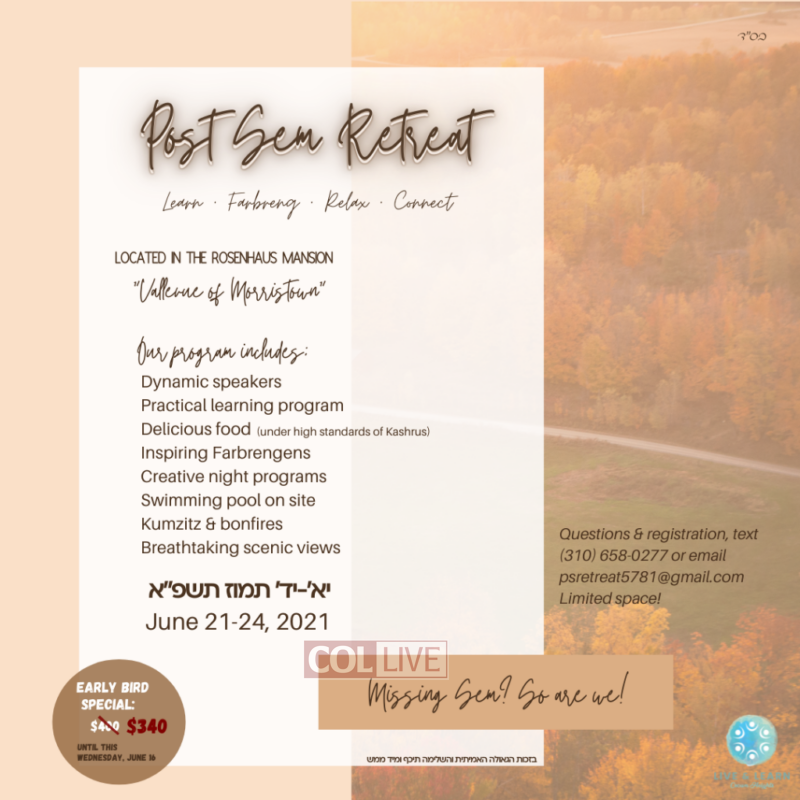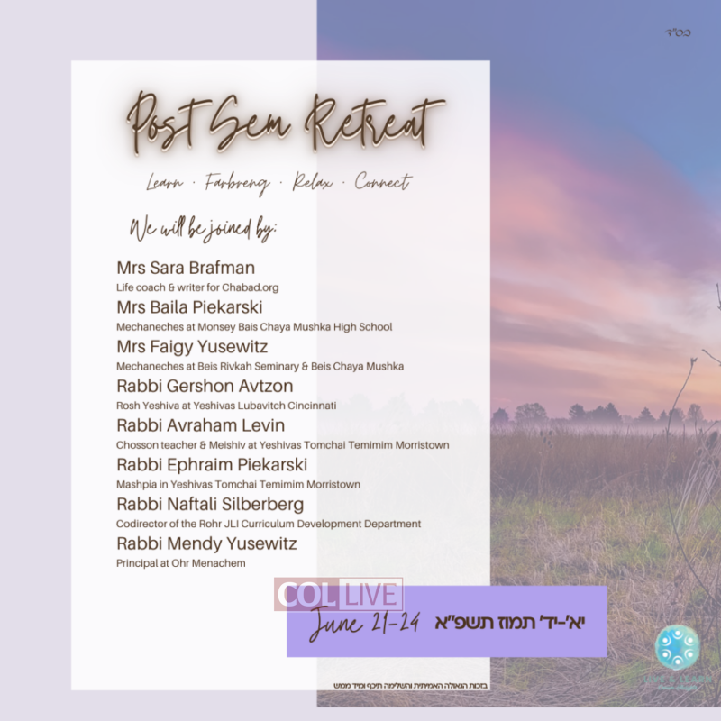 We will be joined by the famed Mechanchim, Rabbi Mendy and Faigy Yusewitz, throughout the duration of the program. We will also be joined by various acclaimed Mashpiim, Rabbanim, and Shluchim, including Rabbi Naftali Silberberg, Rabbi Ephraim Piekarski, Rabbi Avraham Levin, and Rabbi Gershon Avtzon. Noted life coach and writer for Chabad.org, Mrs. Sara Brafman will be sharing her wisdom, as well as Mrs. Baila Piekarski and many others.