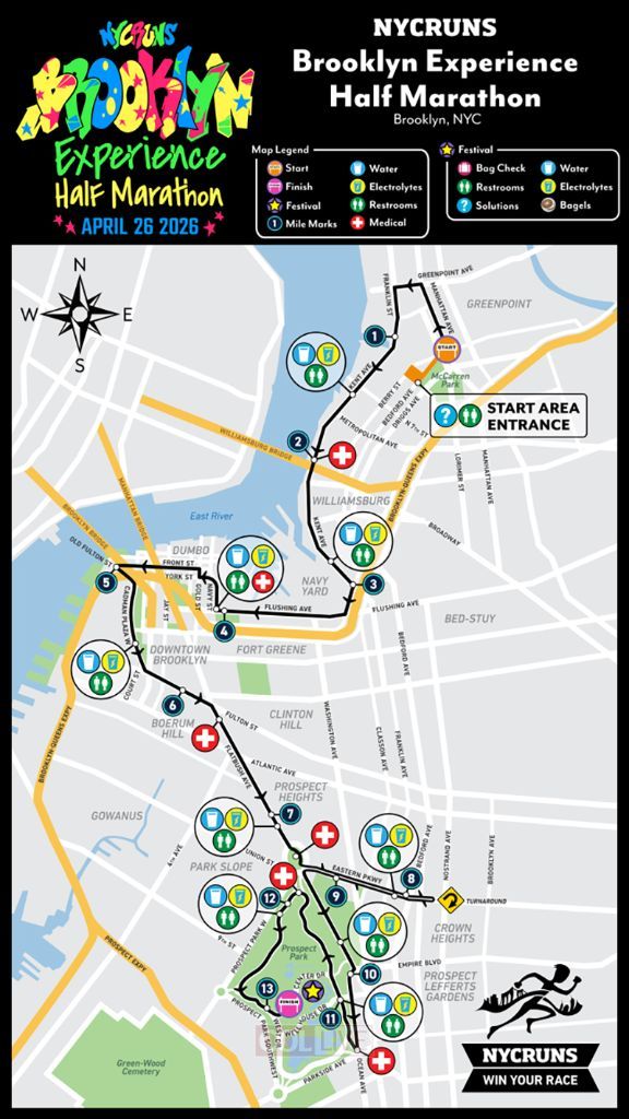 The course starts near McCarren Park in North Brooklyn, then hugs the East River under the Williamsburg, Manhattan and Brooklyn Bridges before heading inland along Fulton Street and Flatbush Avenue. From there, runners swing past Grand Army Plaza and finish inside Prospect Park. The official course map and start and finish plans from NYCRUNS highlight the streets most likely to see temporary shutdowns as well as the post-race festival zones. Expect off-and-on closures along Fulton Street, Flatbush Avenue, Atlantic Avenue and Court Street as the race field rolls through downtown Brooklyn.