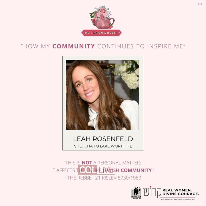• Mrs. Leah Rosenfeld, Shlucha to Lake Worth, FL, who will talk about the incredible growth she experiences through the women and girls in her community.