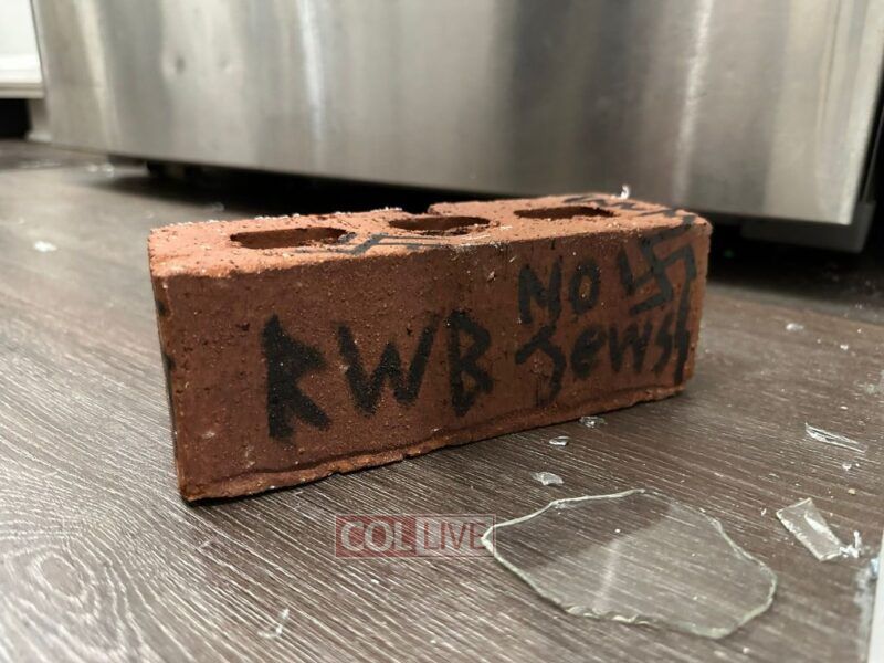 Individuals who were in the center at the time were shocked to hear a window shatter and see a painted brick hit the floor, which they discovered was covered in antisemitic and white supremacist language and swastikas.