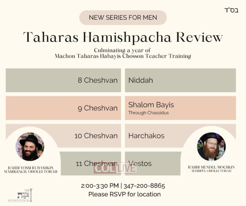 What makes these series extremely unique is, that these Shiurim will be delivered by very special individuals. They are a select group of hand-picked by our Machon to lead the way as up-and-coming Chosson Teachers! They recently completed rigorous training in Halacha, Hashafa, and Hadracha by many Rabbonim, Mashpim, veteran Chosson Teachers, professionals in medical fields, and more.