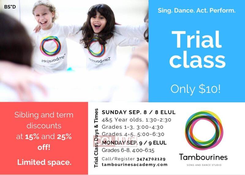 They are offering a trial class this Sunday and Monday September 8/9 – Ches/Tes Elul where new students ages 4-18 can get a glimpse of the magic at Tambourines.