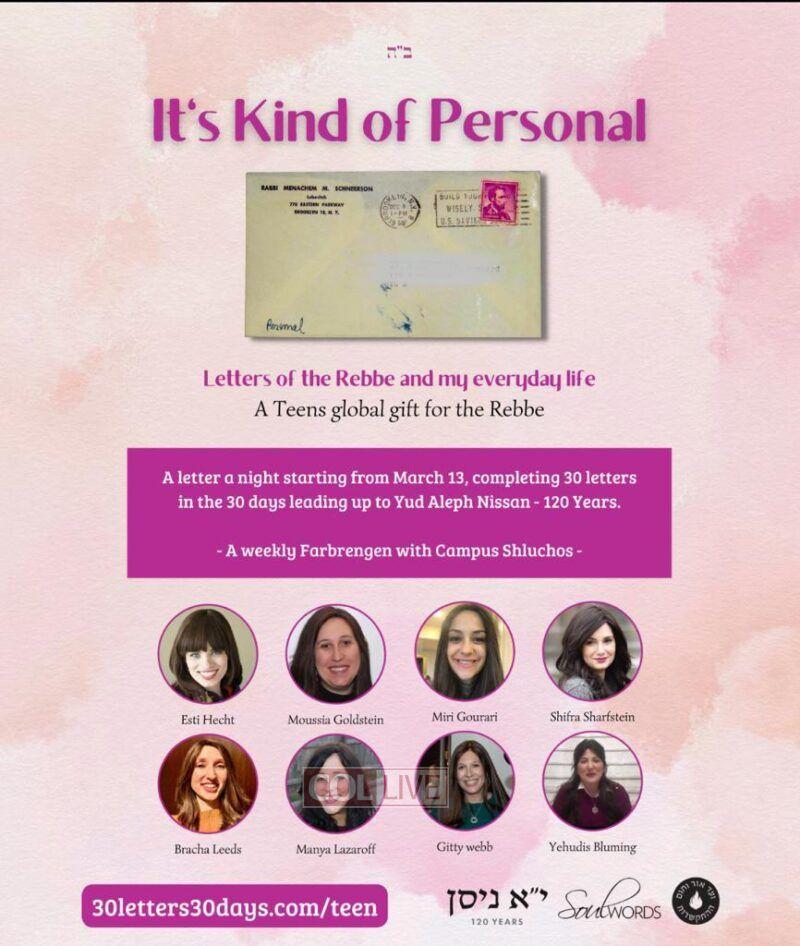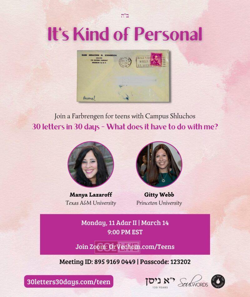 An exciting online class will give an opportunity for teens to learn and farbreng with their favorite Campus Shluchos about 30 Letters in 30 days leading up to Yud Aleph Nissan.