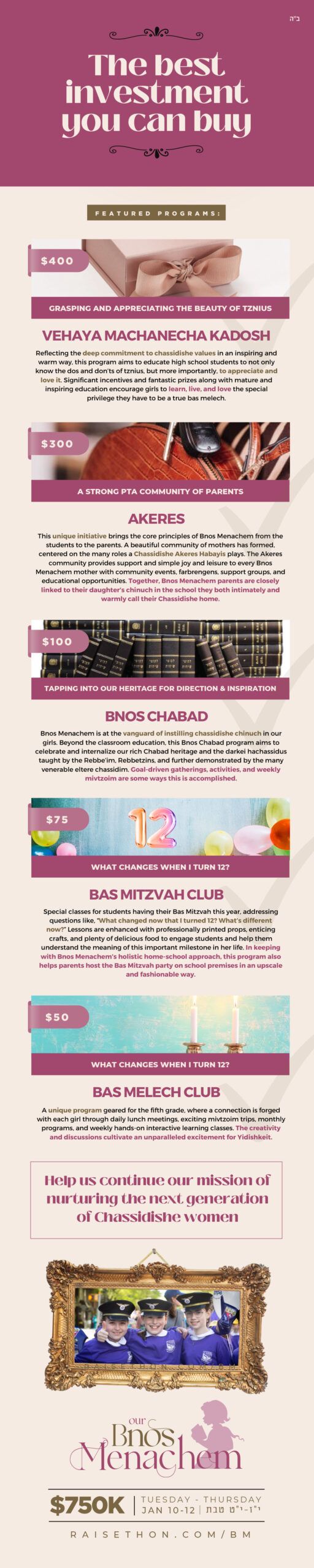 Even if your daughter doesn’t attend Bnos Menachem, you are helping our Shchuna and our global community by contributing to our campaign. Your tzedaka dollars are an investment into so many valuable activities with incalculable effects.