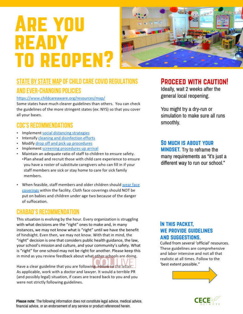 The CECE – Chabad Early Childhood Education Network has been in continuous communication with our members who are Chabad Preschool leaders and directors from around the world. We understand the complications that arise when considering reopening, and we are at the forefront, assisting and supporting Shluchim through these turbulent times.