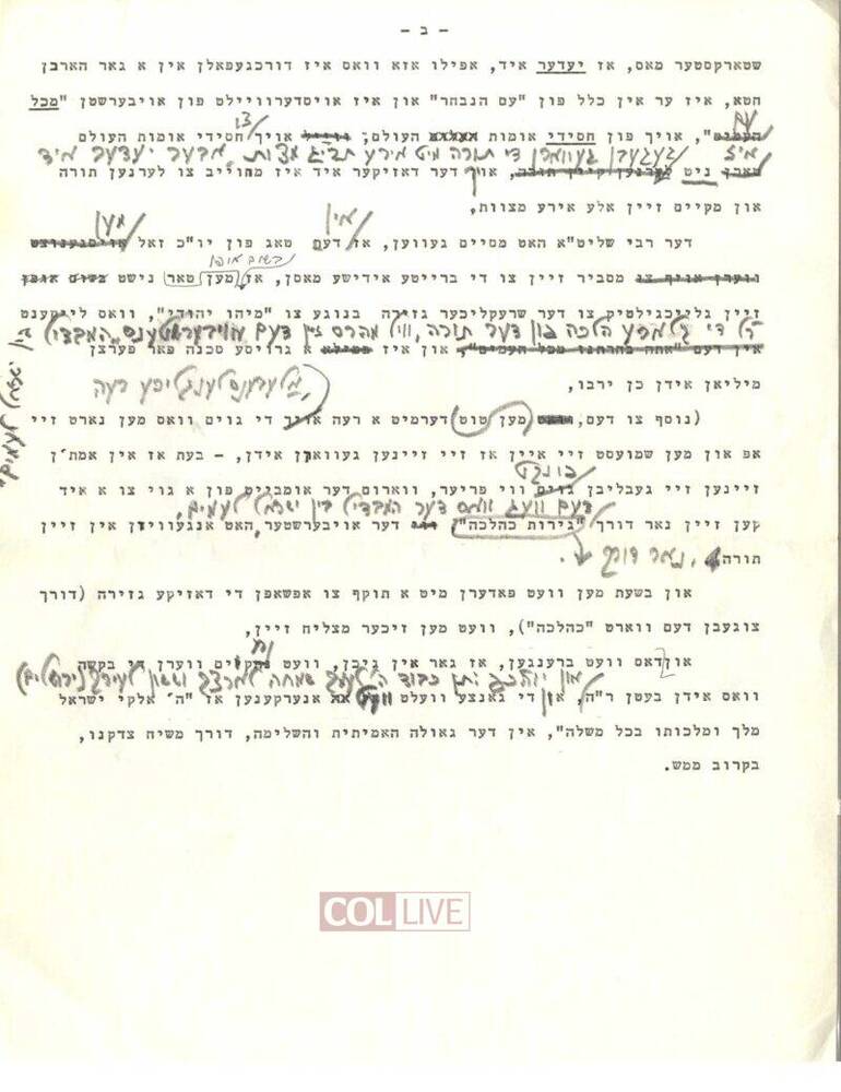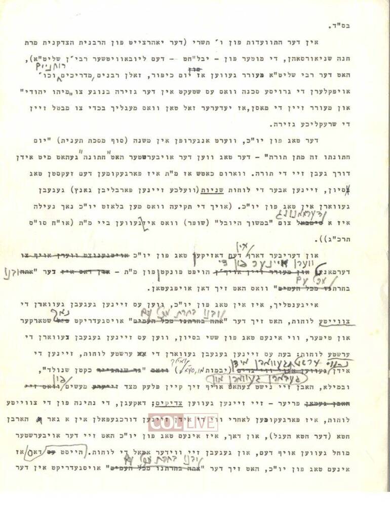 It is a synopsis of the Rebbe’s farbrengen, prepared by the Rebbe’s Choizer Rabbi Yoel Kahan – that took place on the sixth Yahrzeit, Vov Tishrei 5731 (1970), when the Rebbe spoke sharply about the need to correct the law of “Who is a Jew” in the Land of Israel, and requested that rabbis and community leaders utilize their Yom Kippur sermons to address the issue, taking advantage of the heightened atmosphere and inspiration found in their synagogues on the holy day.