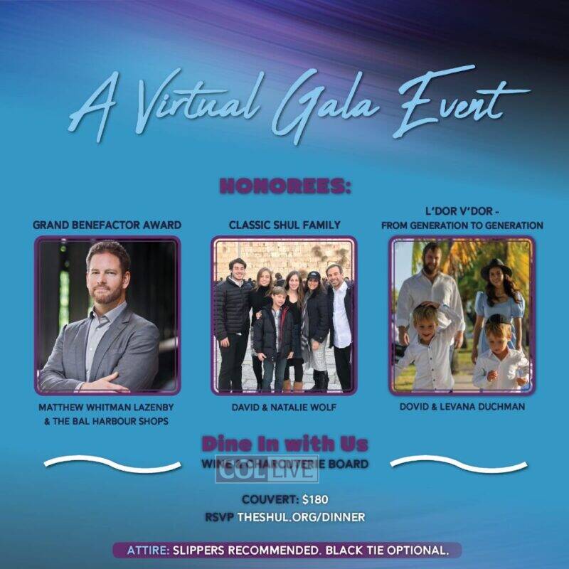 The Shul of Bal Harbour in Florida will hold their virtual 39th annual gala dinner event tonight honoring Matthew Whitman Lazenby, David and Natalie Wolf and Dovid and Levana Duchman.