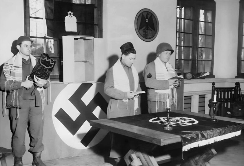 The photo was taken during Purim in the Holocaust, March 1945. A group of Jewish American soldiers arrived at the vacation home of Joseph Goebbels, the Nazi regime’s Minister of Propaganda.