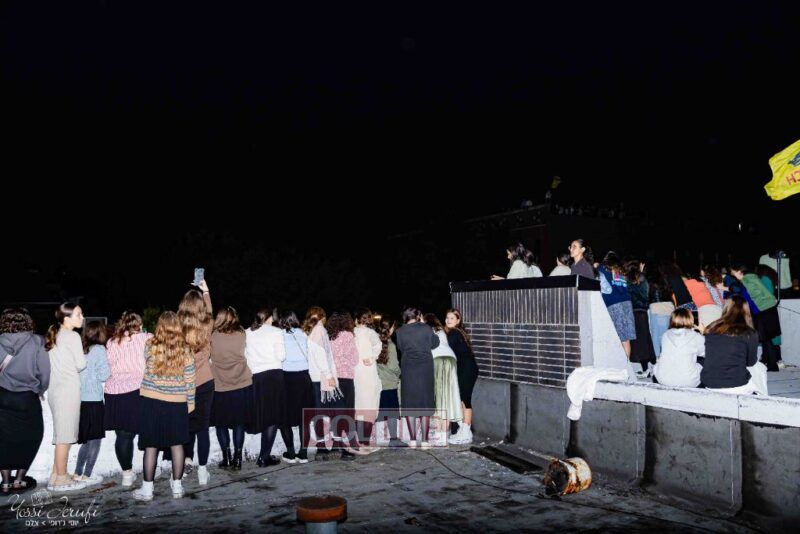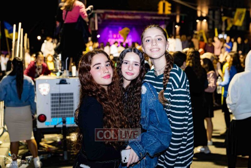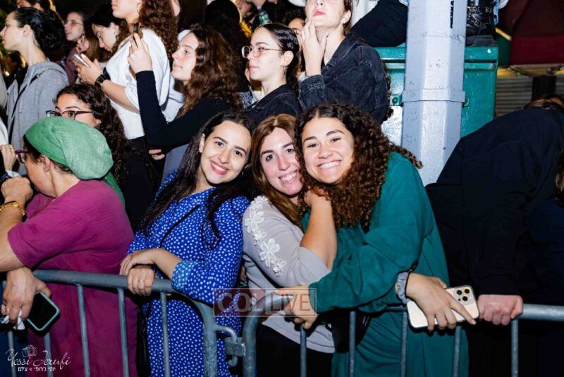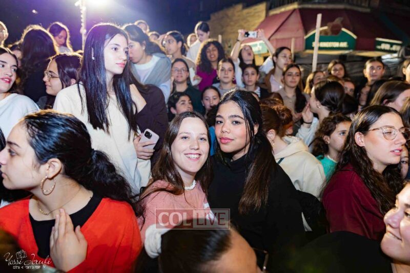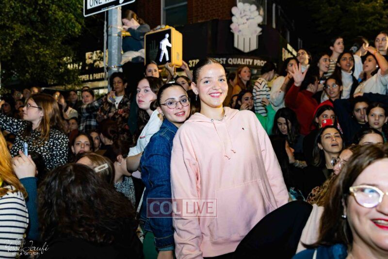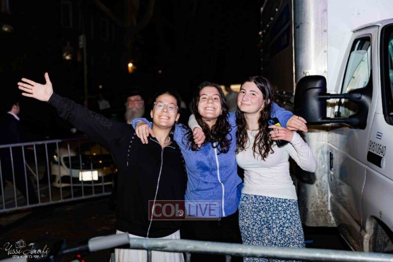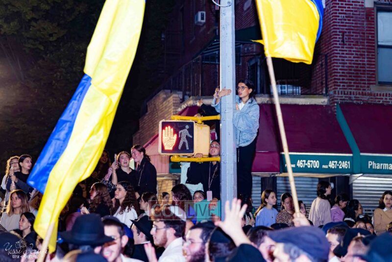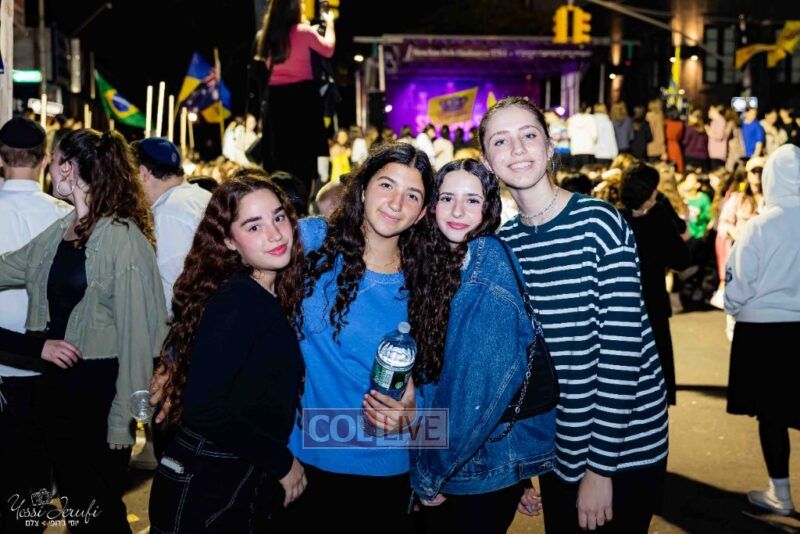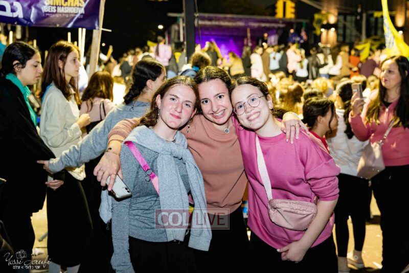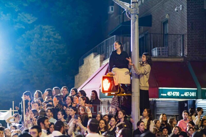 Women and girls were present as Chassidim and bochurim danced on Kingston Avenue during the nightly Simchas Beis Hashoeva celebration in Crown Heights on Tuesday. Photos