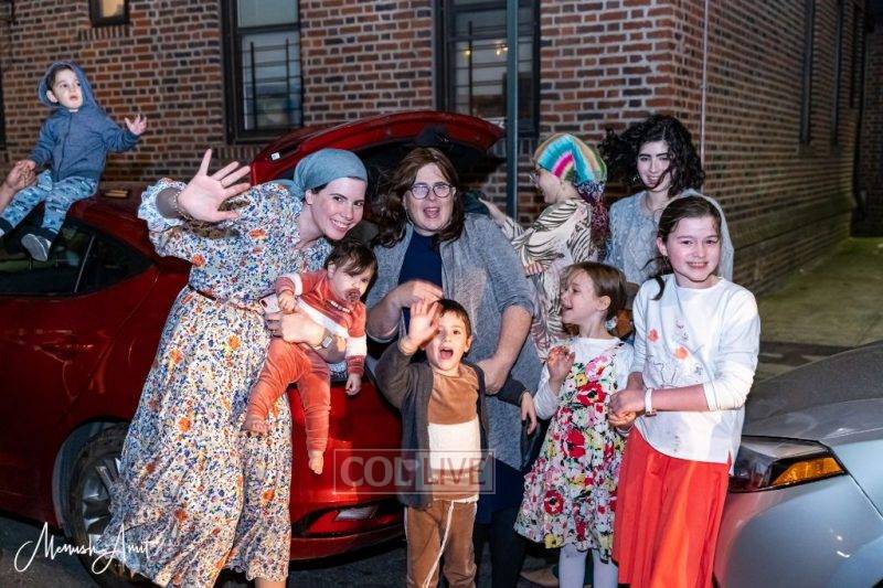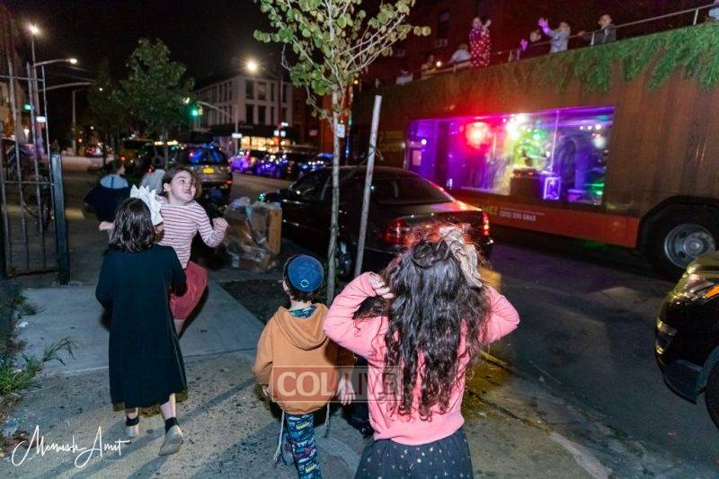 A Simchas Beis Hashoeva bus drove through the streets of Crown Heights Wednesday night of Chol Hamoed, bringing the joy of Yom Tov to the entire neighborhood.