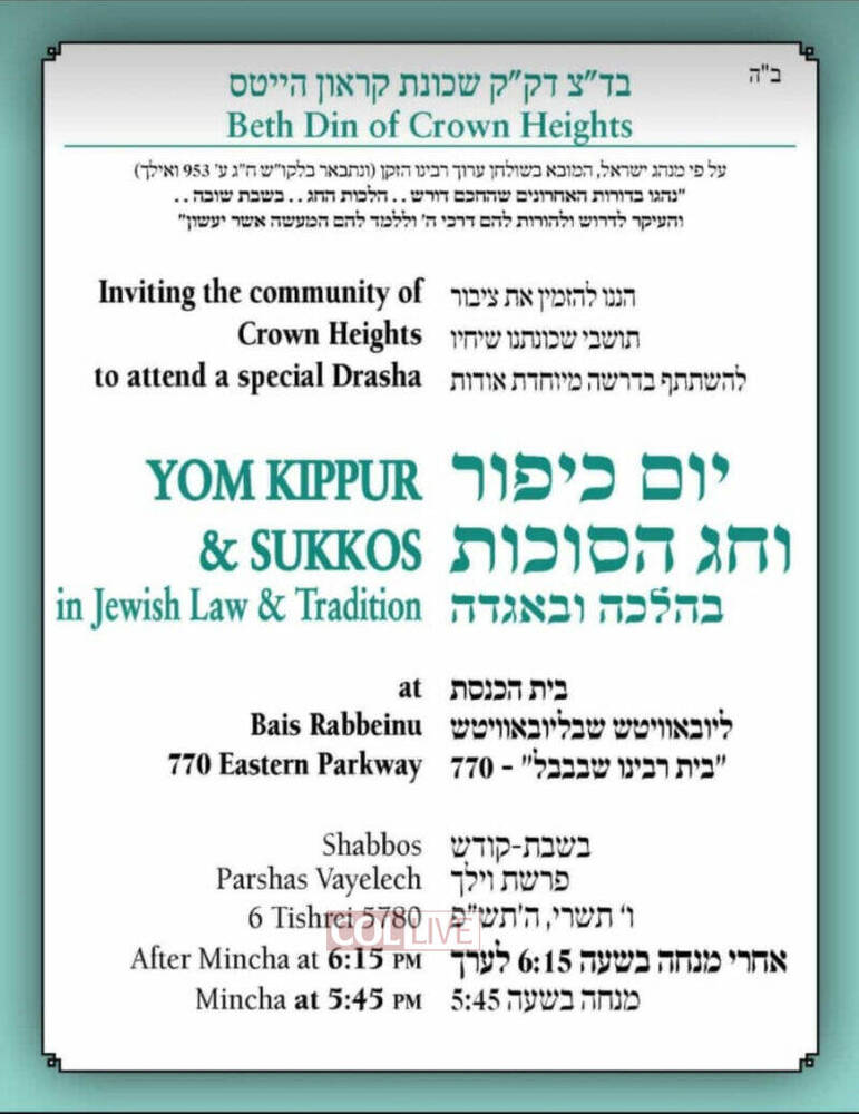 Badatz Crown Heights is inviting the public to a “special drasha” on the halachos on Yom Kippur and Sukkos on Shabbos day at 6:15 pm at 770 Eastern Parkway. Full Story