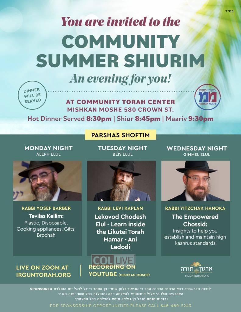 The lectures will be taking place at the community Beis Medrash 580 Crown Street, Mishkan Moshe. Mondays, Tuesdays and Wednesdays.
