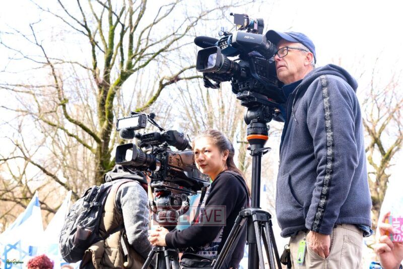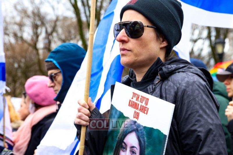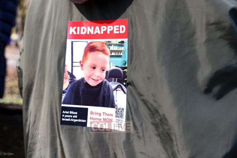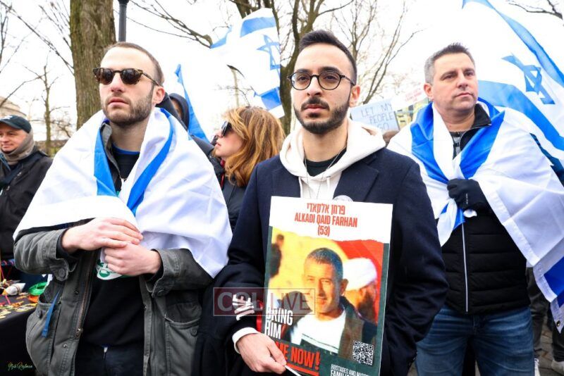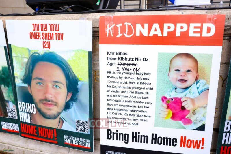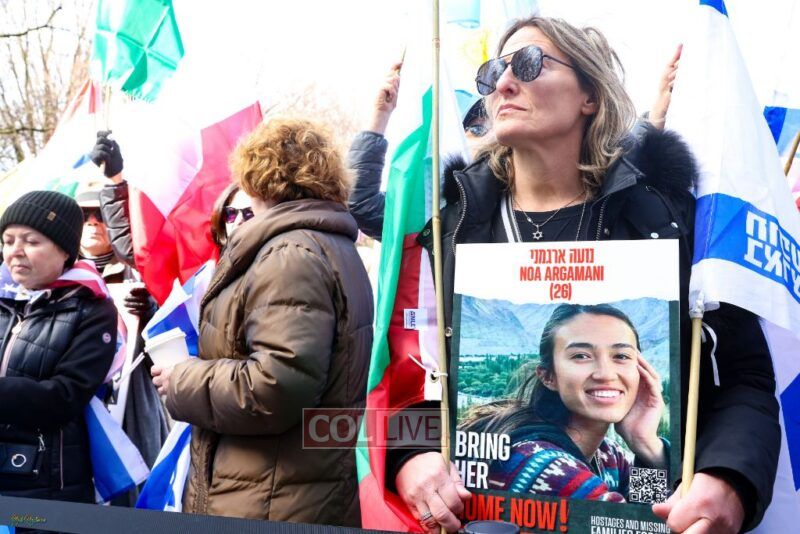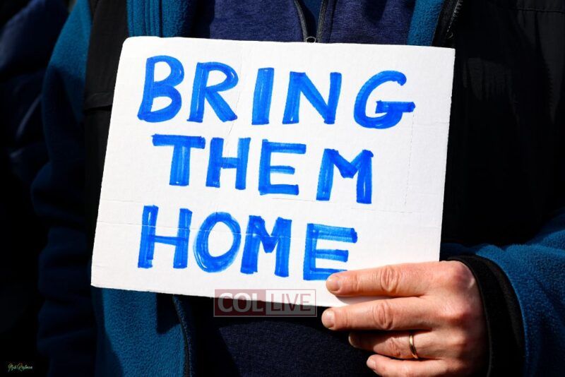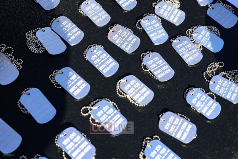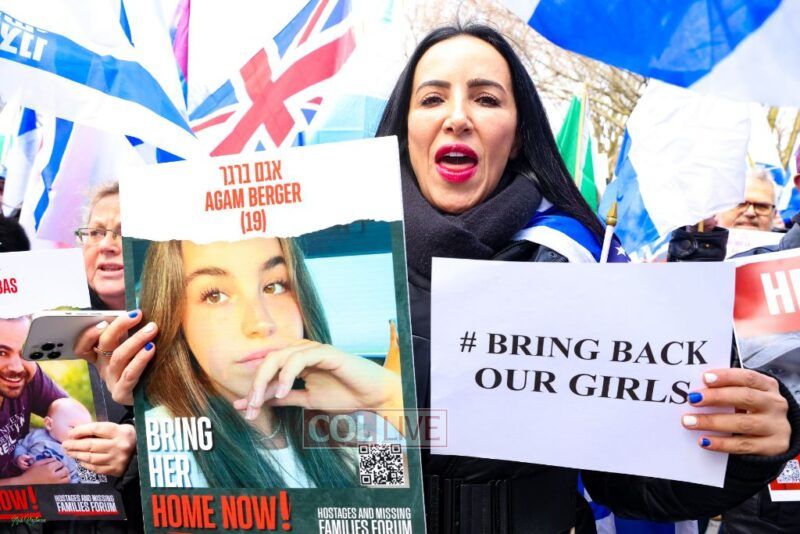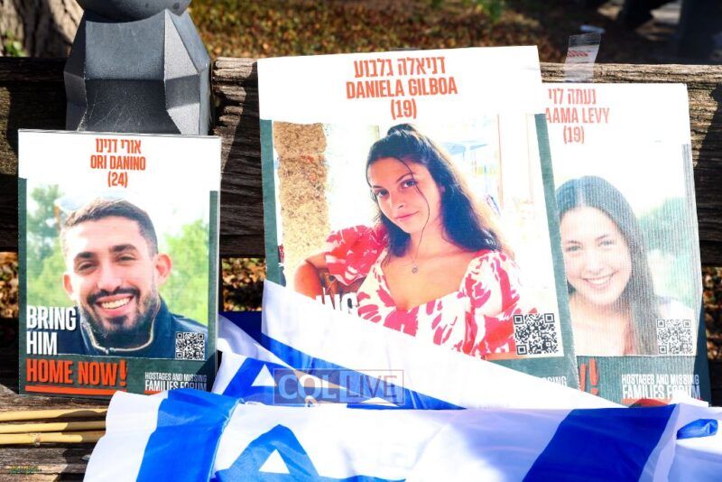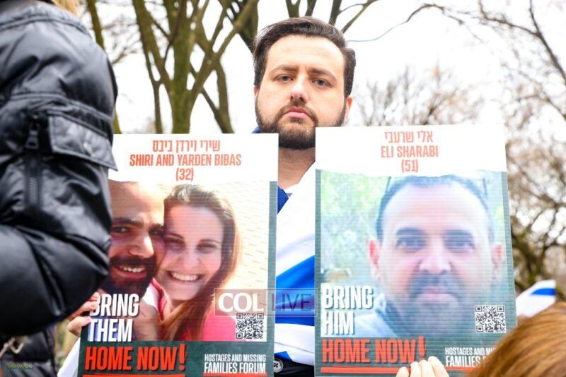 Many held signs with photos of the hostages, some with “156 days” written on the placards, the number of days since the hostages were taken. Organizers distributed flags from over 30 countries representing the different nationalities of the hostages.
