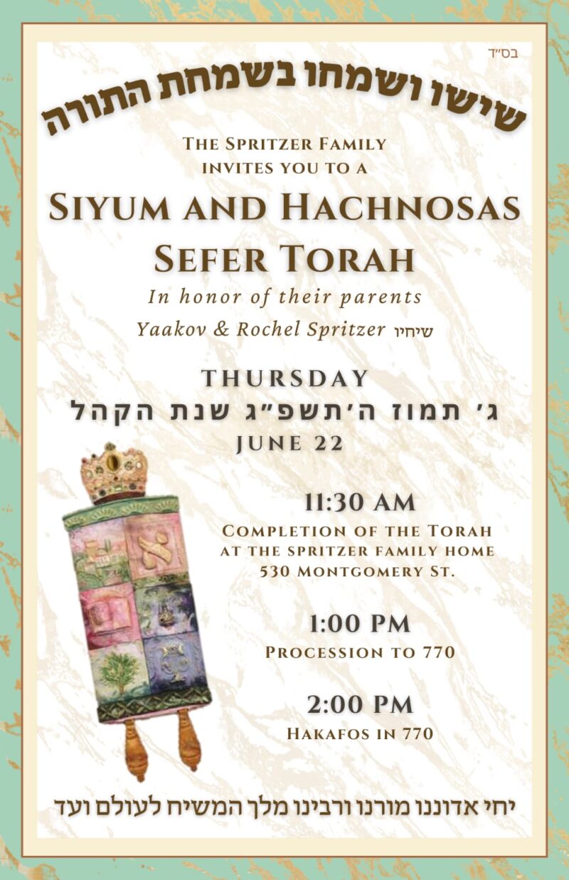 The Spritzer family is generously donating a Torah in honor of their beloved parents, R’ Yaakov and Rochel Spritzer, who will be gracing the occasion with their presence.