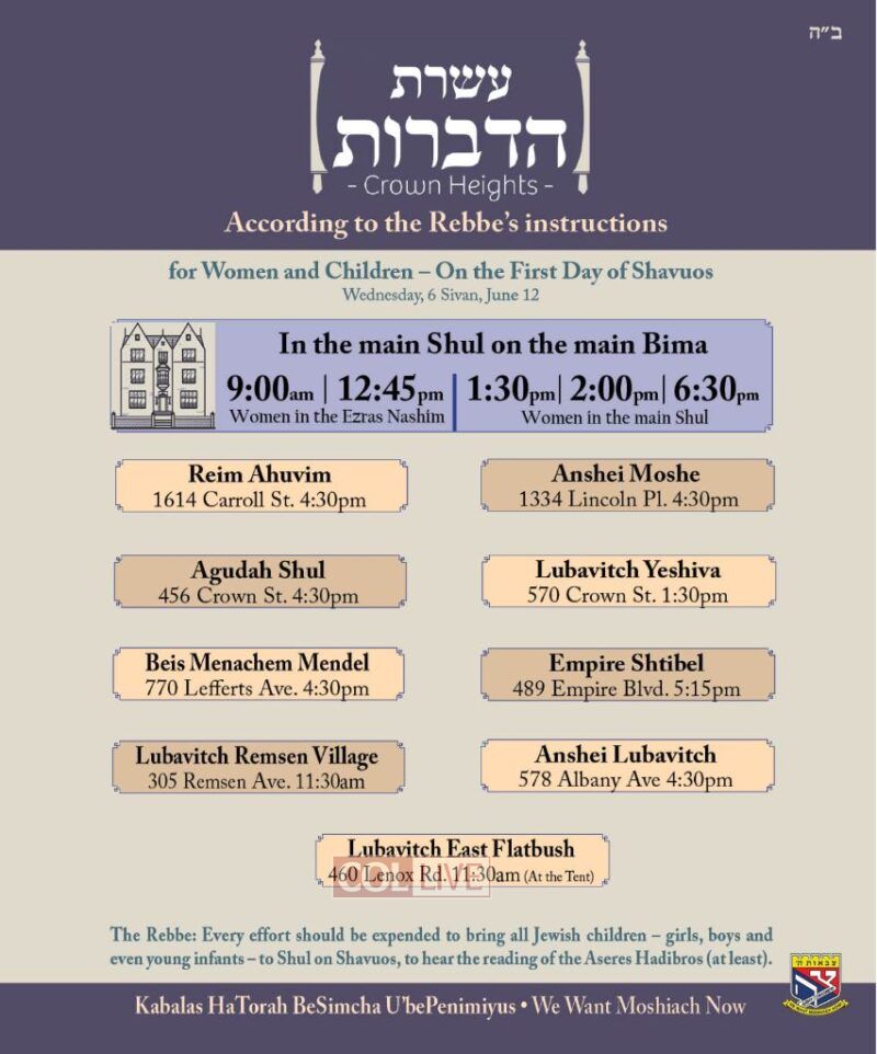 Minyonim for Aseres Hadibros will be held in the following 11 locations around Crown Heights, and beyond, to allow all men, women and children to attend.