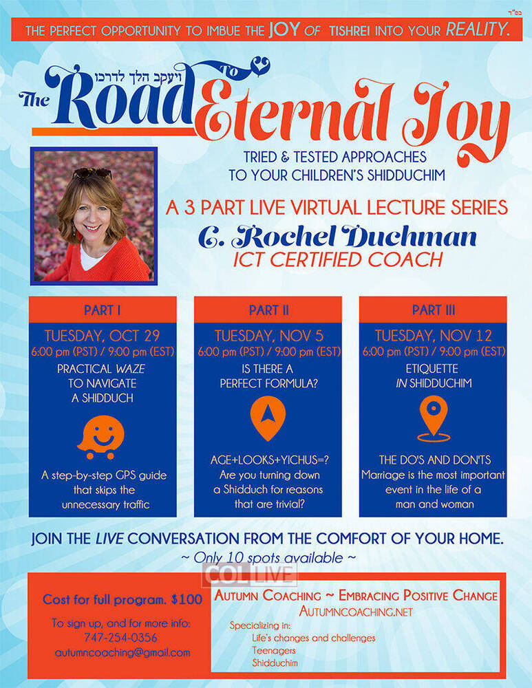 After receiving dozens of requests during the Month Of Tishrei – ICT Certified life coach Rochel Duchman will once again be giving another live Virtual Lecture Series helping parents navigate through the journey of Shidduchim.