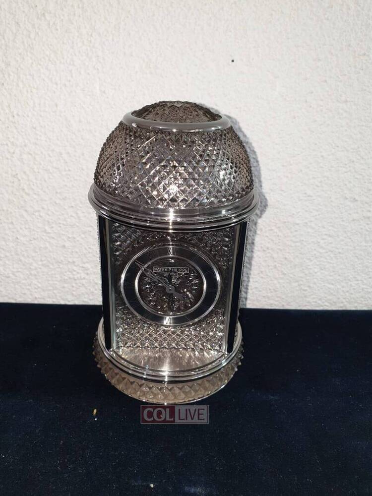 The limited-edition dome table clock presented by Erlanger to the Rebbe is one of only four pieces in the world. It was designed and crafted by a team of Patek Phillipe’s most accomplished artists in collaboration with Baccarat, with its exclusive design inspired by the stately chandeliers crafted by this venerable French firm. Baccarat craftsmen spent up to 70 hours of concentrated work hand-engraving the geometric relief patterns adorning the clock—beveled diamond-cut for the body and delicate rosettes for the dome and dial center. The hour circle is embellished with black-enameled Roman numerals.