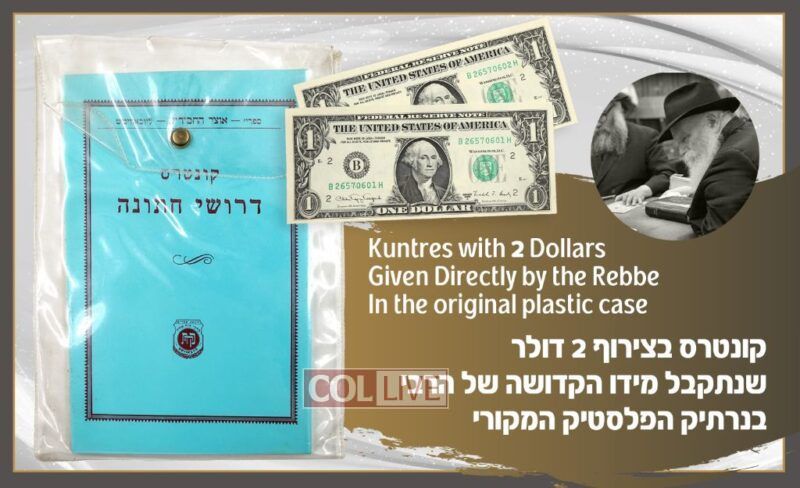 The letter is now displayed on the Moreshet website as part of a special catalog introducing dozens of Chabadic items including most of the Rebbe’s Chalukot that were given directly by him, beginning with a pocket edition of the Tanya that was handed out in 1972, through Tanyas with an enclosed dollar, Kuntresim, dollars and coins and ending with the last Chalukah of Purim Katan 1992.