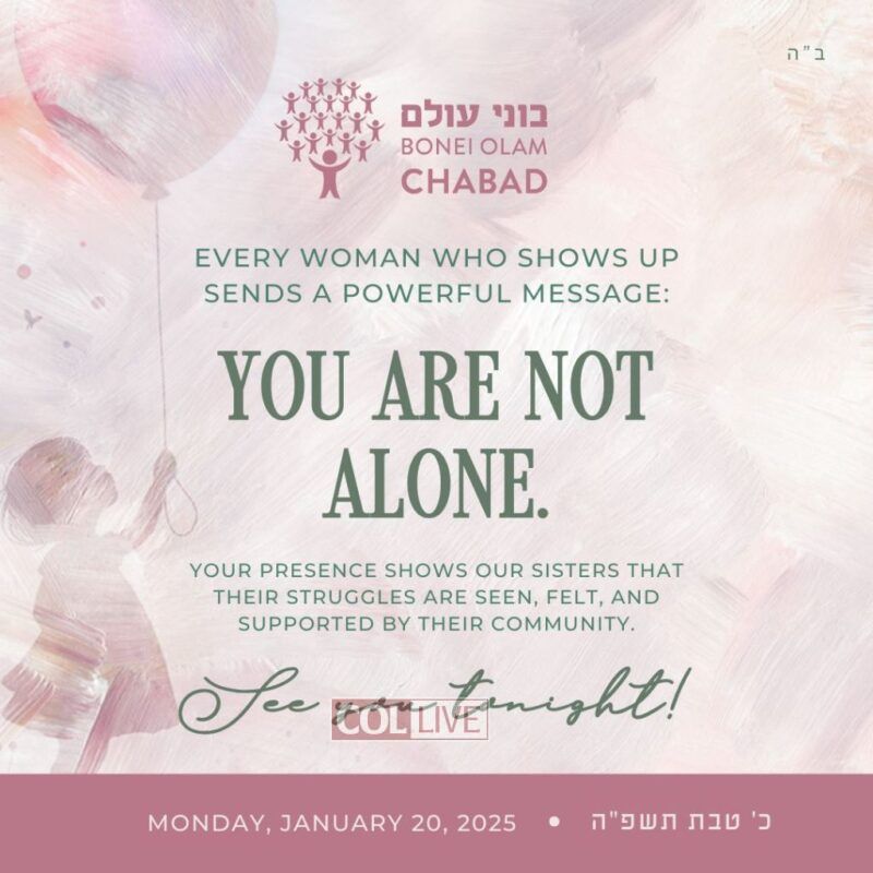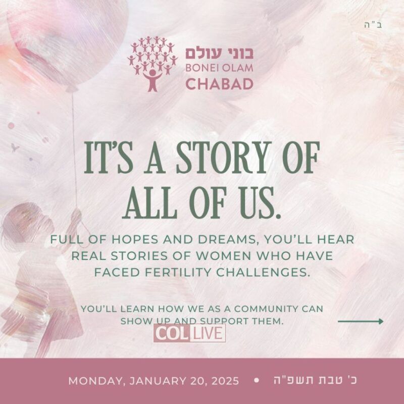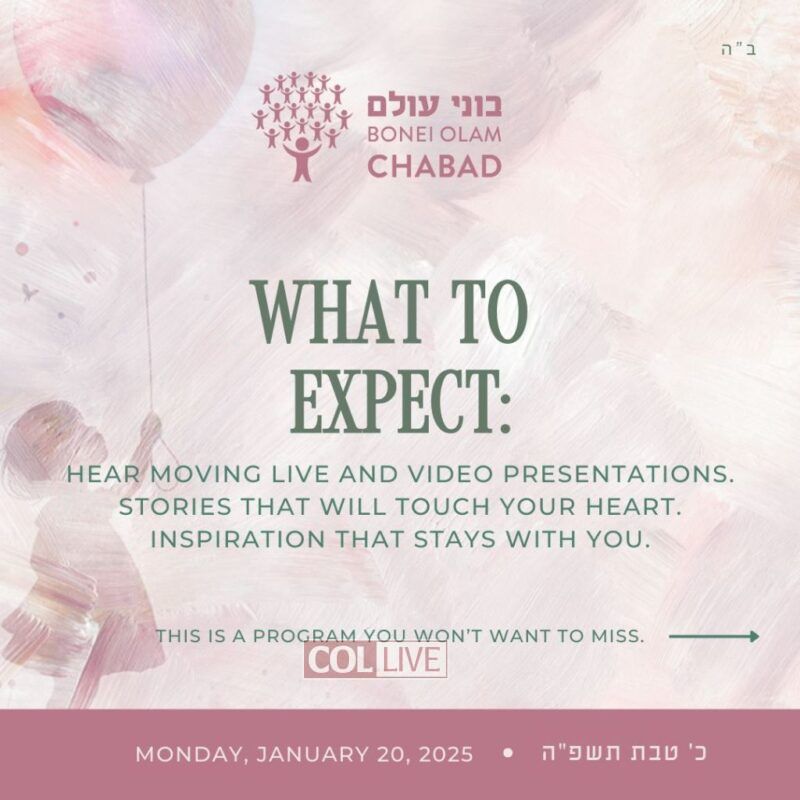 Join host Mrs. Rivkah Slonim for an evening of connection, inspiration, and impact. Hear from Rabbi Bochner, and the stories of Bonei Olams miracles that Crown Heights helped facilitate.