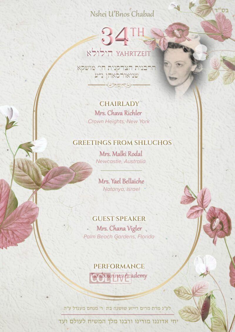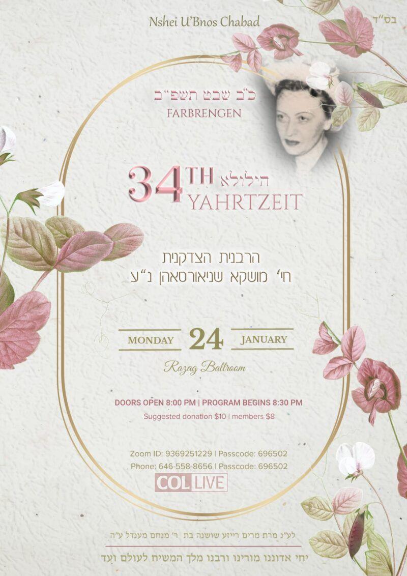 Nshei ubnos Chabad invite all women and girls to celebrate the 34th Yartzeit hillula of Rebbetzin Chaya Mushka Schneerson.