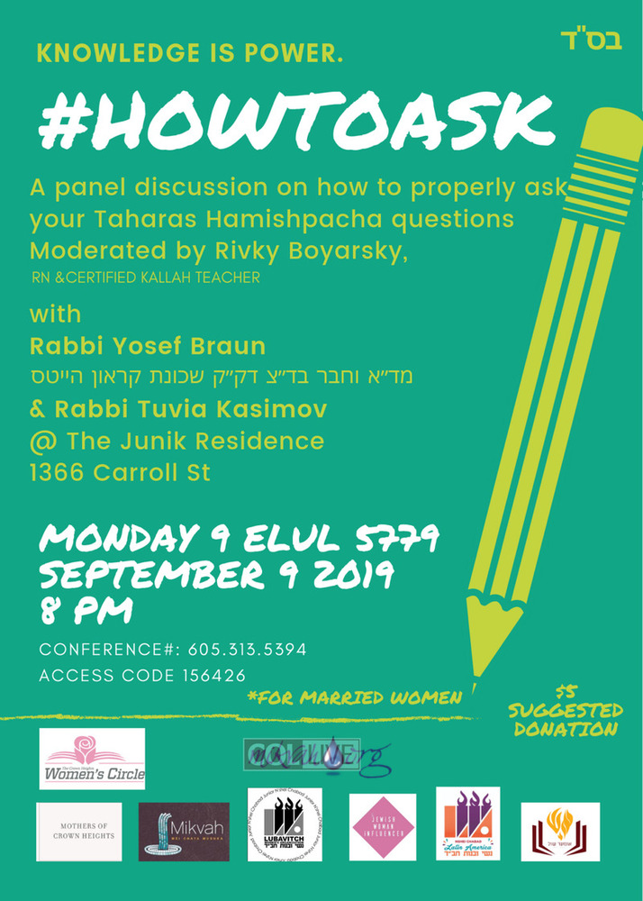 The event, titled “How to Ask,” will be a panel discussion on how to properly ask your Taharas Hamishpacha questions, and will feature Crown Heights Bais Din Rabbi Yosef Braun and Rabbi Tuvia Kasimov.