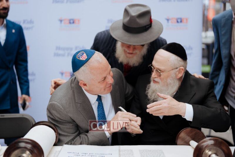 The Torah’s completion ceremony took place in the heart of Times Square, where the final five Hebrew letters of the word Yisroel were written by five remarkable individuals: Holocaust survivor Jerry Wartski; Hagai Angrest, father of Israeli hostage Matan Angrest; Maurice Schneider, uncle of the Bibas family; Yarden Pinhas, an 8-year-old patient battling leukemia; and Rabbi Shea Hecht.