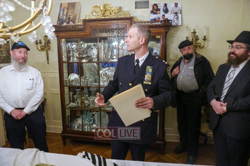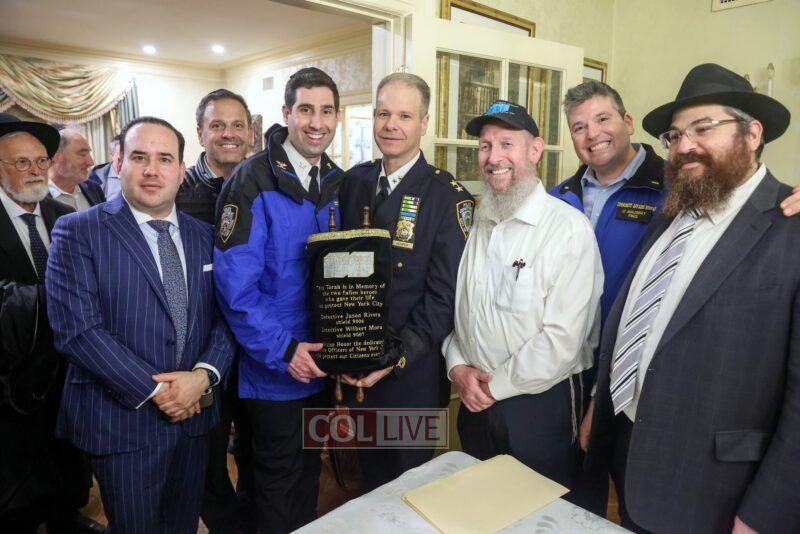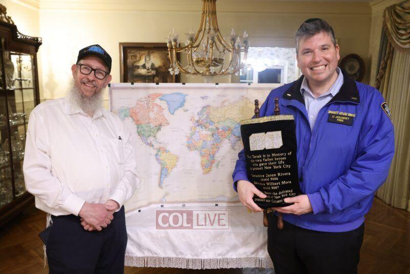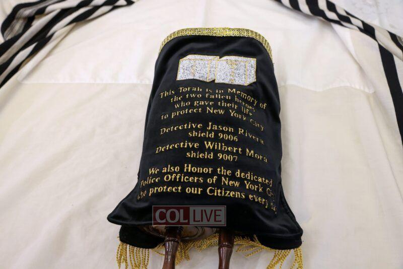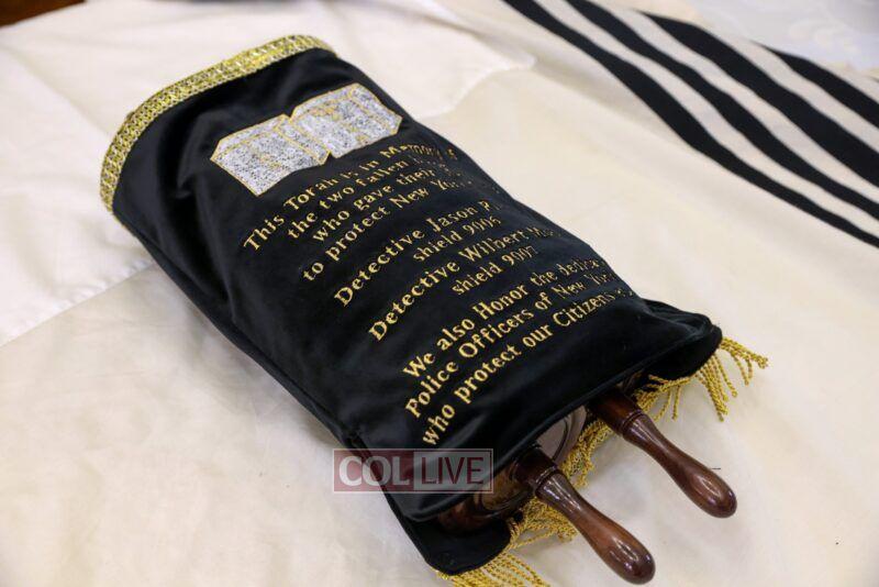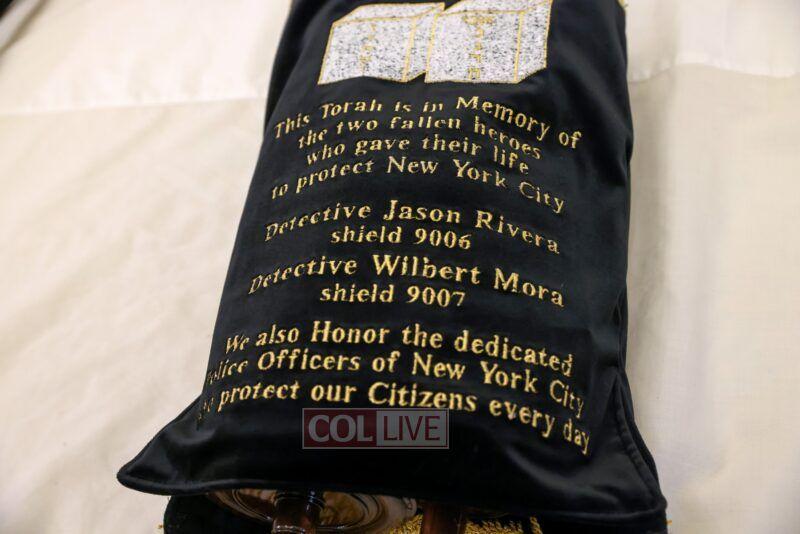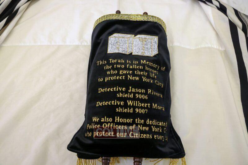 The Torah is in memory of Detective Jason Rivera, Shield number 9006 and Detective Wilbert Mora Shield number 9007. The Torah also honors every Police officer in New York City who put their life on the line each day for New Yorkers.