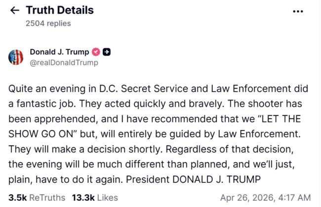 “Quite an evening in D.C. Secret Service and Law Enforcement did a fantastic job. They acted quickly and bravely. The shooter has been apprehended, and I have recommended that we ‘LET THE SHOW GO ON’ but, will entirely be guided by Law Enforcement,” Mr. Trump wrote. “They will make a decision shortly. Regardless of that decision, the evening will be much different than planned, and we’ll just, plain, have to do it again.”