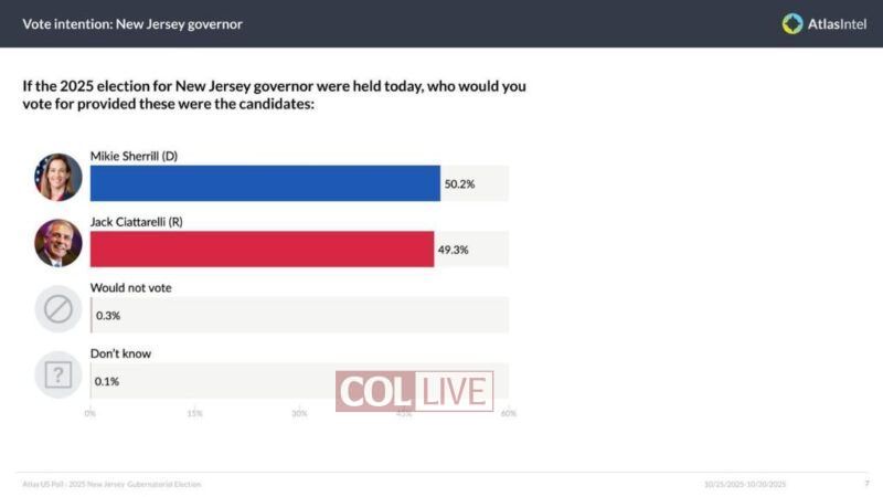The race to replace term-limited Governor Phil Murphy is one of the closest in the nation. A recent AtlasIntel poll showed Democrat Mikie Sherrill at 50.2% and Republican Jack Ciattarelli at 49.3%, well within the margin of error.