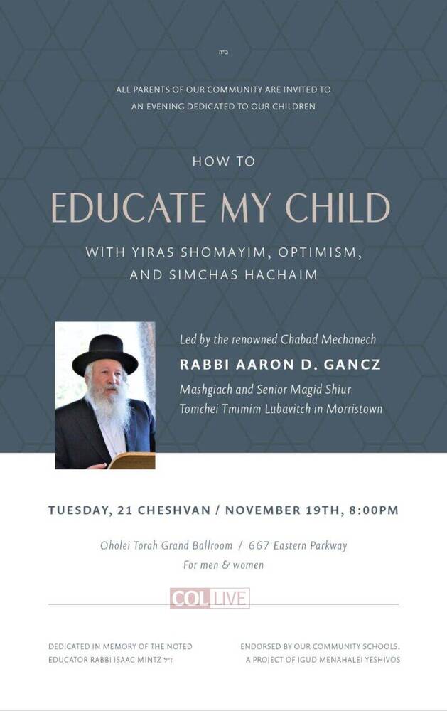 On Tuesday, renowned educator Rabbi Aaron D. Ganz will give powerful chinuch techniques to teach Yiras Shomayim, optimism, and Simchas Hachaim.