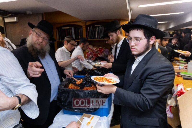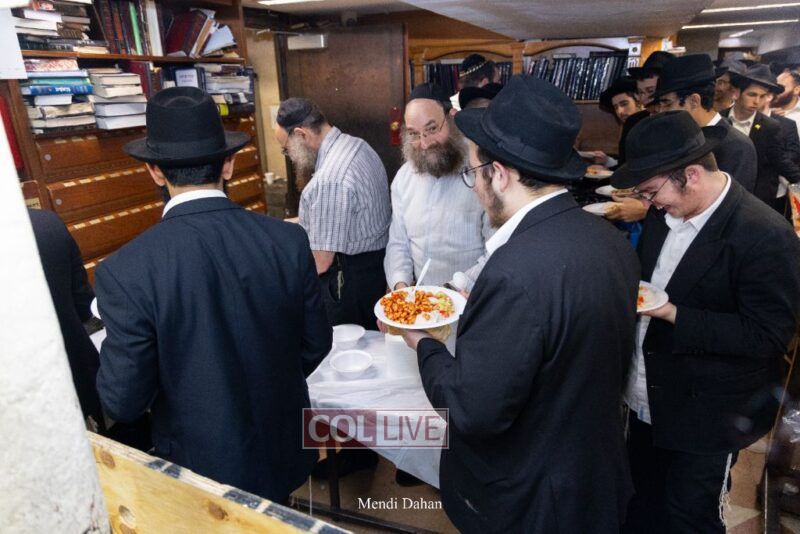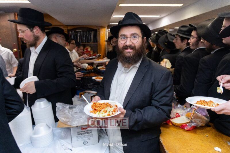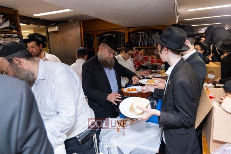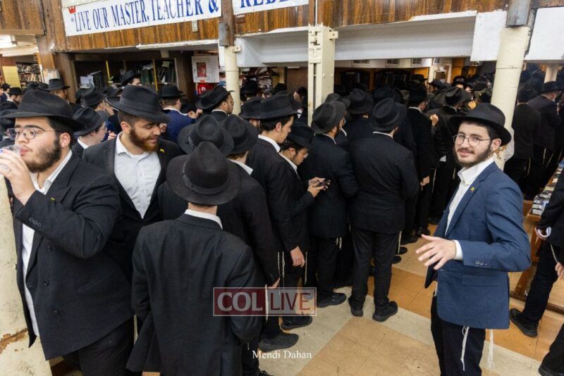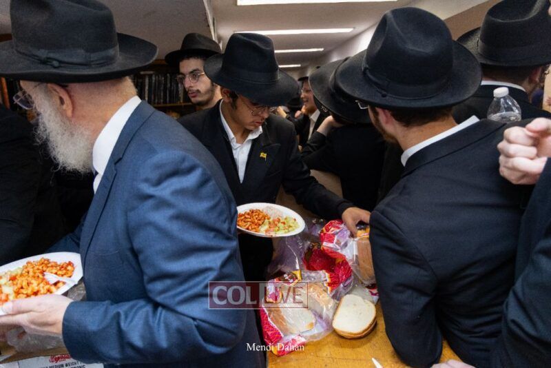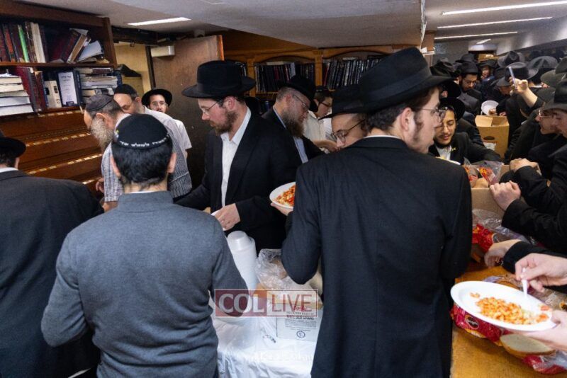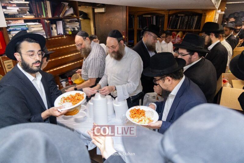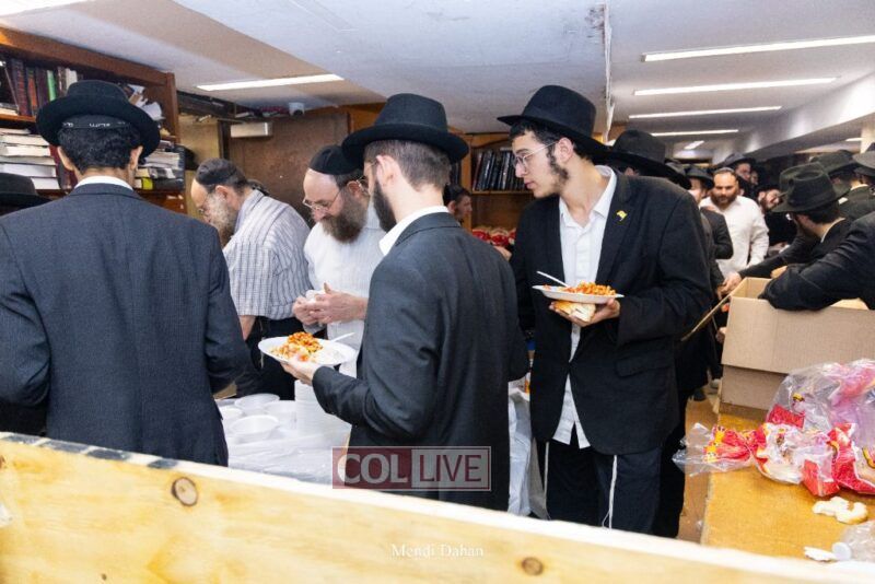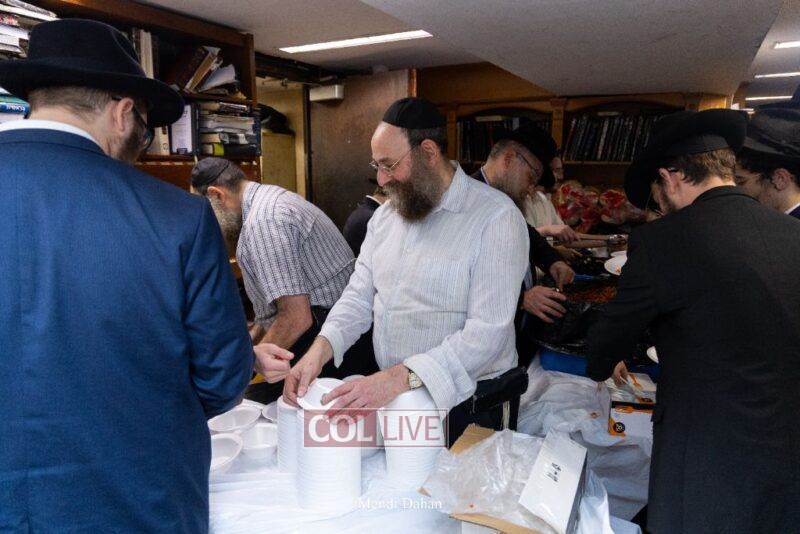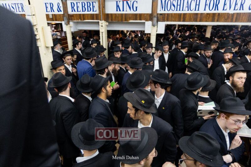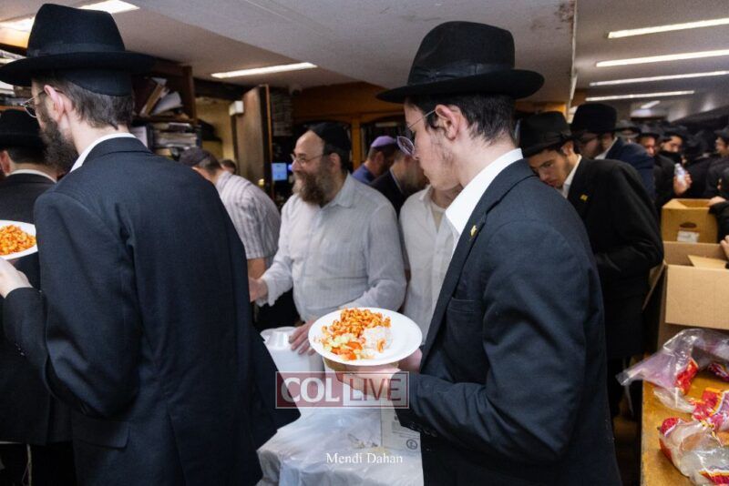 A large crowd davened Mincha and Maariv at the main shul of 770 Eastern Parkway as they concluded the Tzom Gedalia fast day, and then went outside to drink and eat. Photos