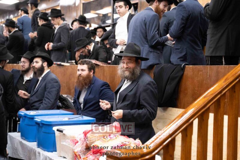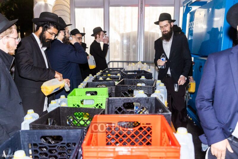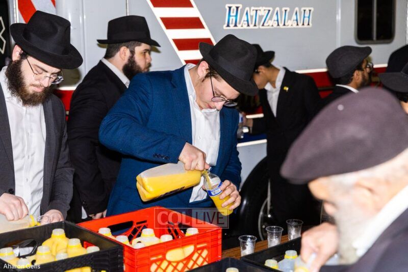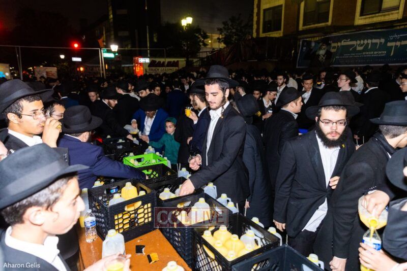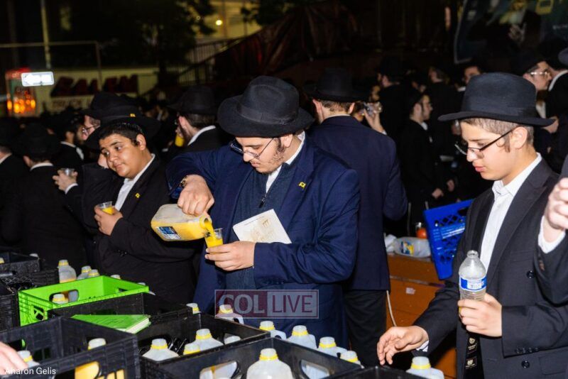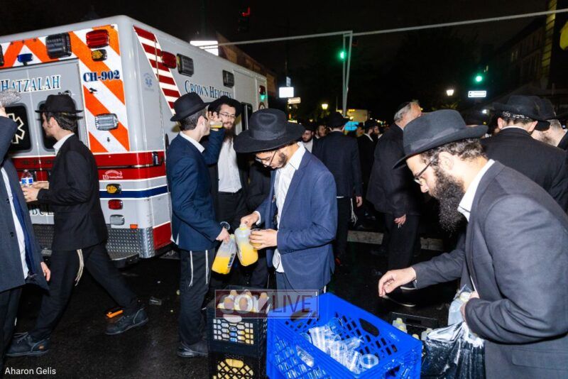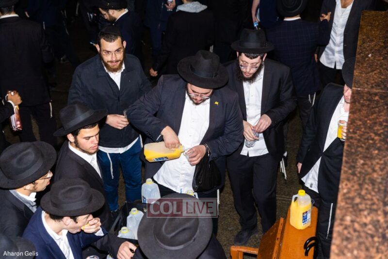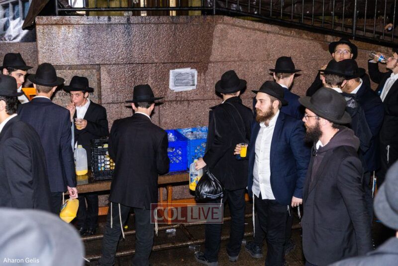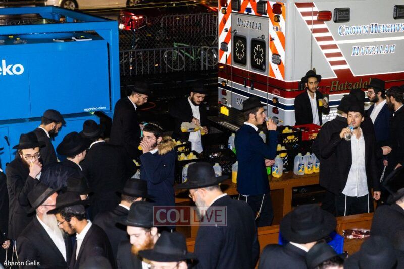 A large crowd davened Maariv at the main shul of 770 Eastern Parkway as they concluded the Tzom Gedalia fast day, and then went outside to drink and eat. Photos