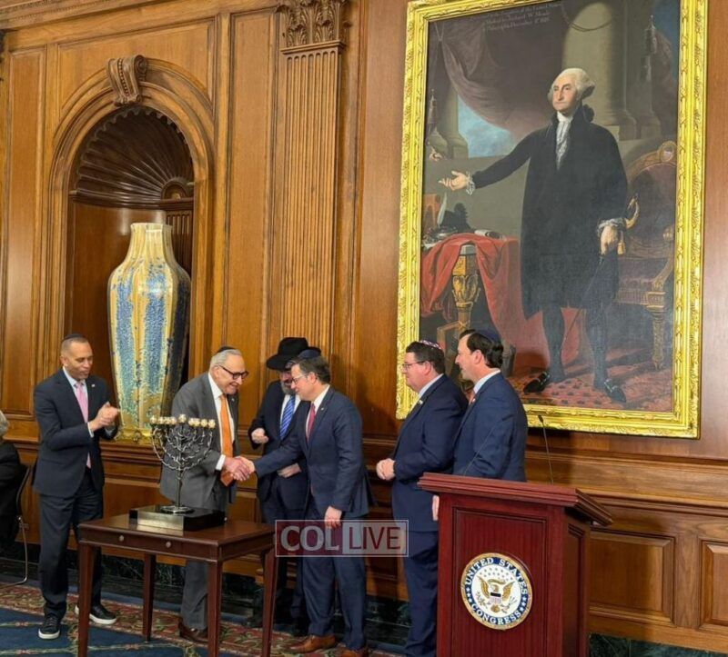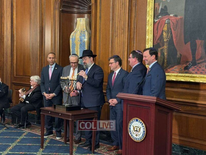 Senate Minority Leader Chuck Schumer (D-NY), House Speaker Mike Johnson (R-LA) and House Minority Leader Hakeem Jeffries (D-NY) came together to kick off a pre-Chanukah celebration in the Rayburn room of the U.S. Capitol on Wednesday, presided over by Rabbi Levi Shemtov, Executive Vice President of American Friends of Lubavitch (Chabad).