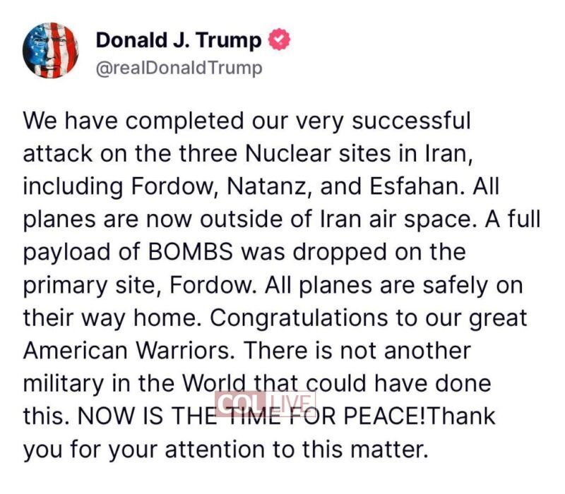 “We have completed our very successful attack on the three Nuclear sites in Iran, including Fordow, Natanz, and Esfahan,” Mr. Trump wrote on Truth Social. “All planes are now outside of Iran air space. A full payload of BOMBS was dropped on the primary site, Fordow. All planes are safely on their way home. Congratulations to our great American Warriors. There is not another military in the World that could have done this. NOW IS THE TIME FOR PEACE! Thank you for your attention to this matter.”