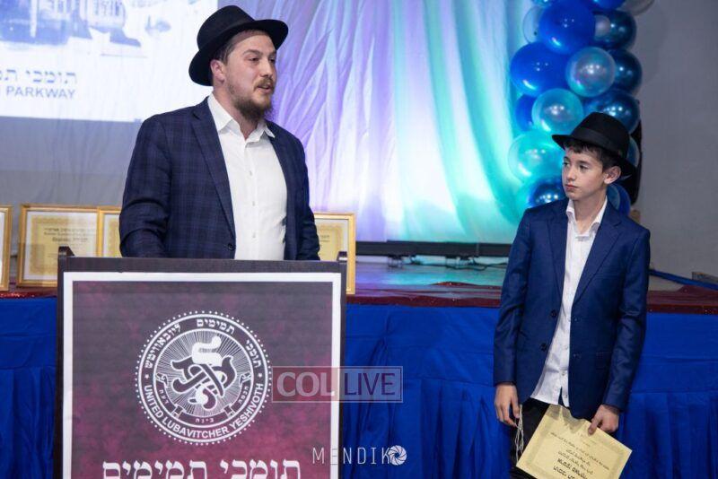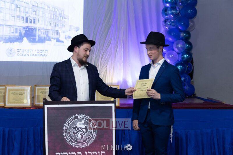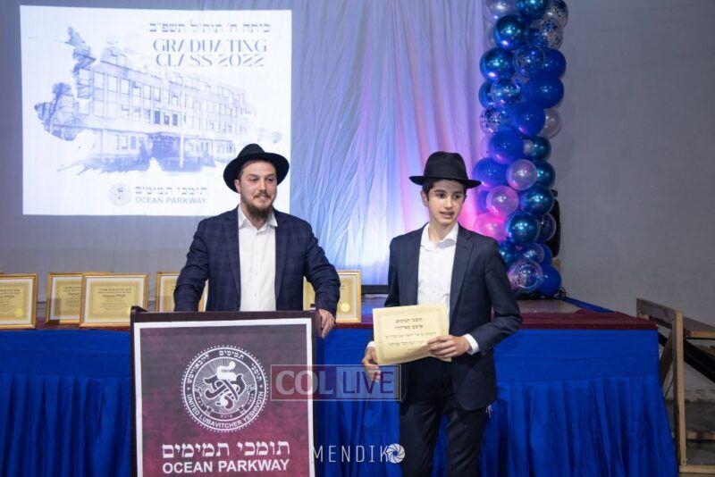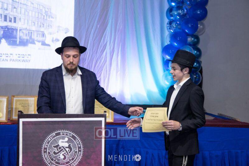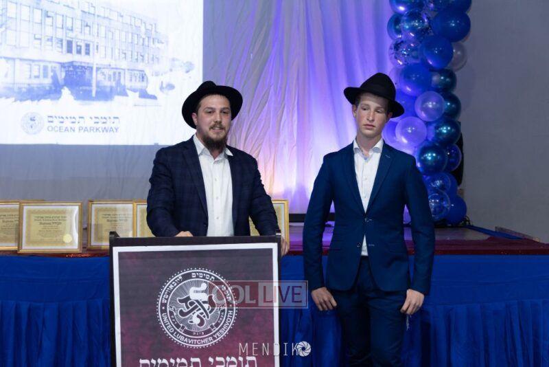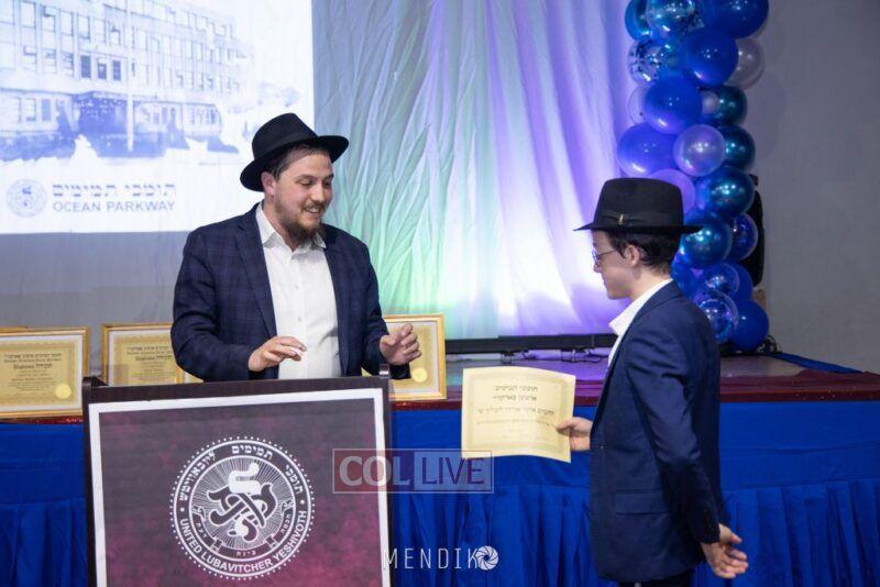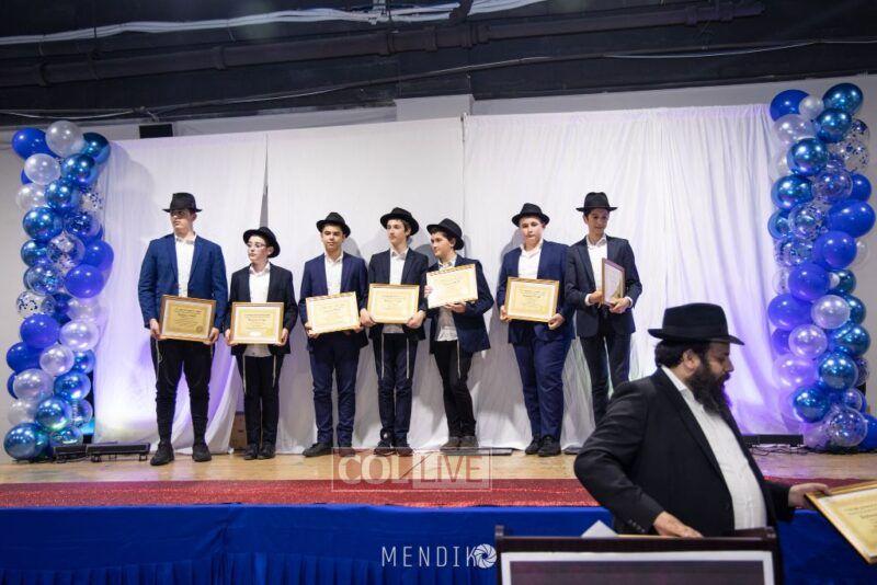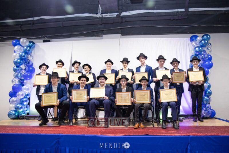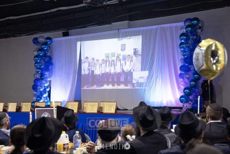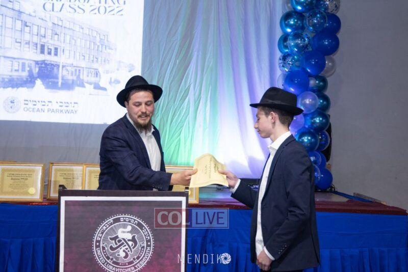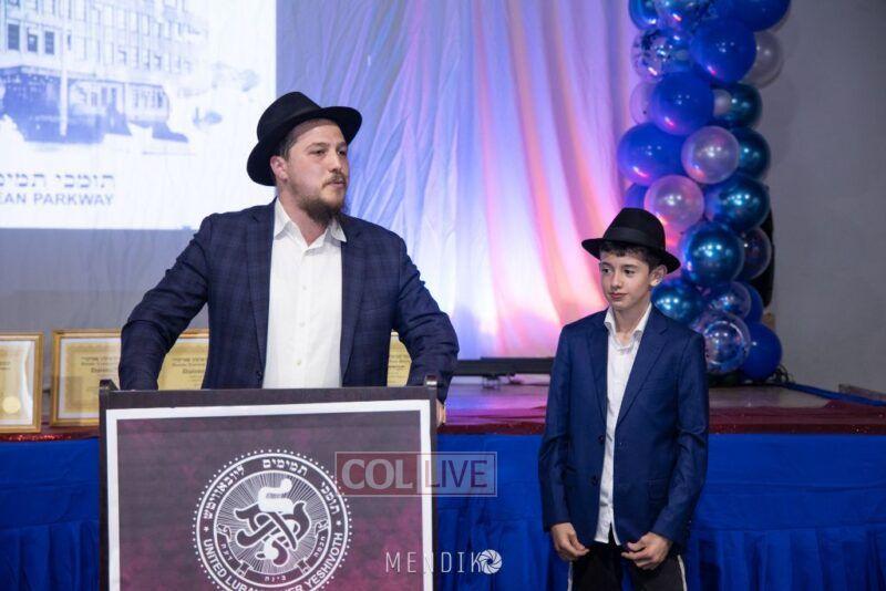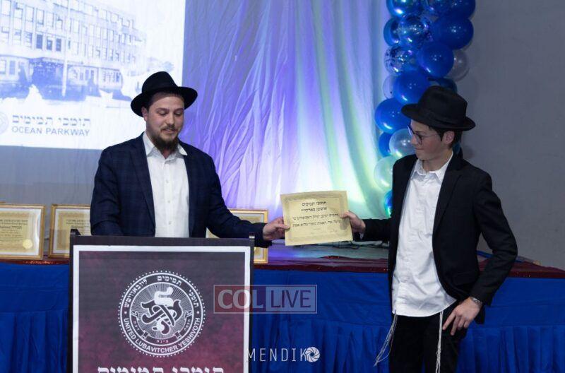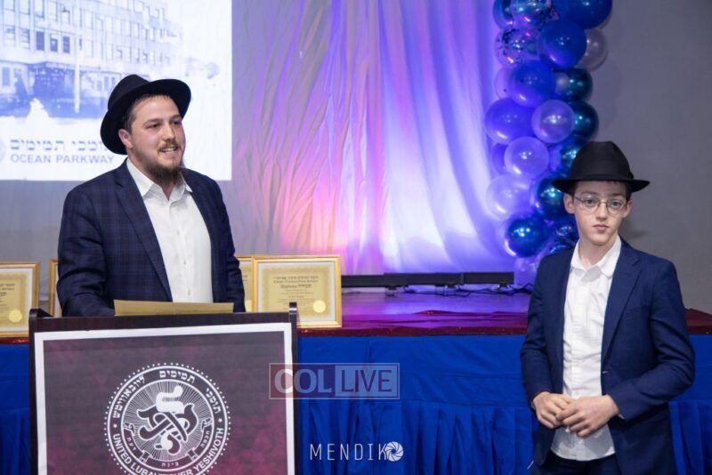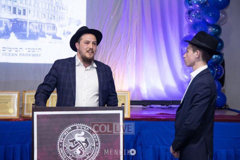 Families of students at Tomchei Temimim of Ocean Parkway gathered Sunday evening for a sit-down dinner and a grand award ceremony celebrating the graduation of the eighth grade talmidim.