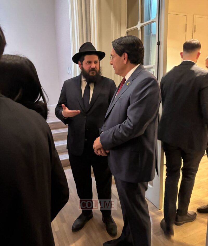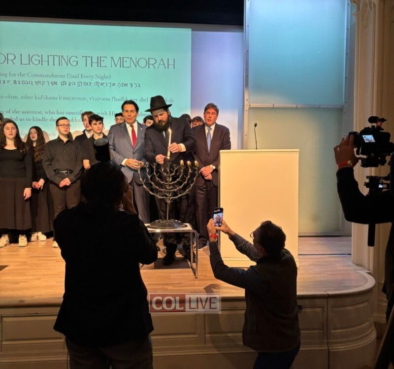 Rabbi Mendy Kotlarsky of Chabad Headquarters was invited to lead the lighting at the event, lighting a menorah made from shrapnel of Iranian ballistic missiles intercepted by Israeli and U.S. interceptors.