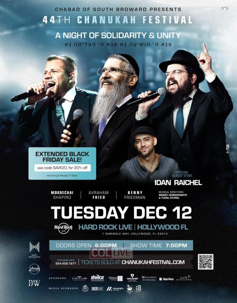 Join us in making a positive impact, while experiencing a musical evening – get your tickets at a reduced price at ChanukahFestival.com. Use Code SAVE20 for 20% off. Prior to selecting seats, simply hit ‘unlock’ to enter code.