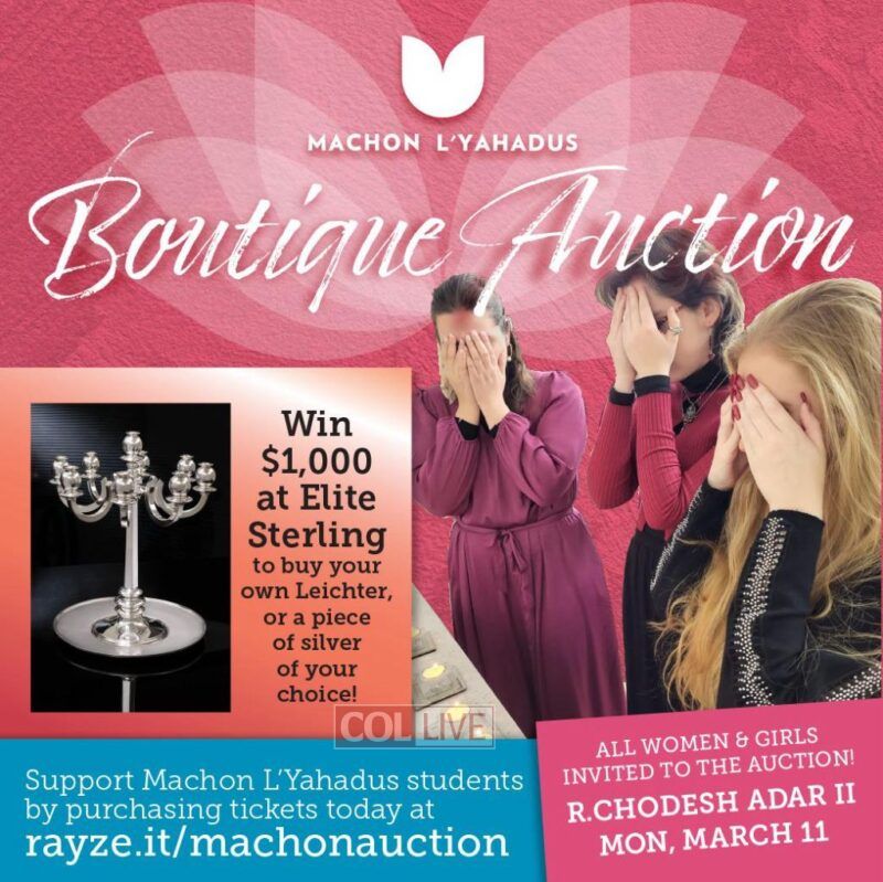 The Boutique Auction takes place Monday, Rosh Chodesh Adar II, March 11th at United Lubavitcher Yeshiva, 570 Crown Street. Doors open at 8:00 pm and the program begins promptly at 8:45 pm.
