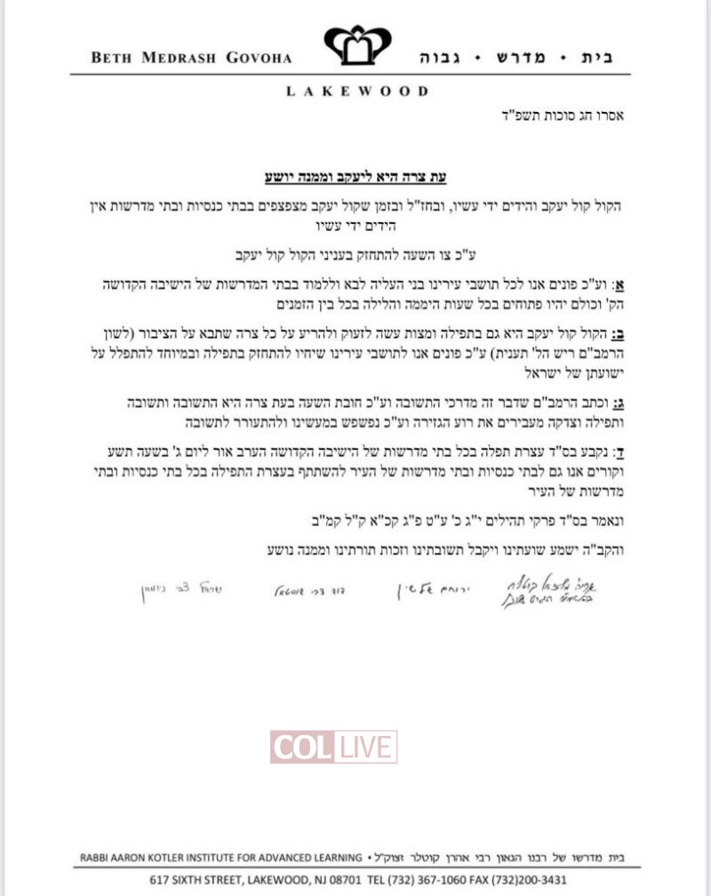 In a poignant and heartfelt response to the ongoing situation in Eretz Yisroel, the roshei yeshiva of Lakewood’s Beth Medrash Govoha have issued a clarion call to the Adirei Hatorah – the esteemed yungeleit – and the broader community, invoking the power Torah, tefillah and teshuvah as a zechus for acheinu Bnei Yisroel in Eretz Yisrael and those valiantly fighting on the front lines.