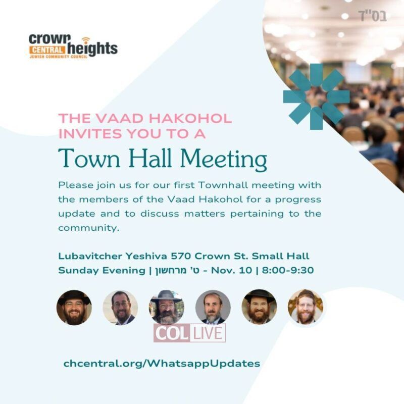 The CHJCC – Crown Heights Vaad Hakohol invites the community to join their first Townhall meeting with the members of the Vaad Hakohol for a progress update and to discuss matters pertaining to the community.
