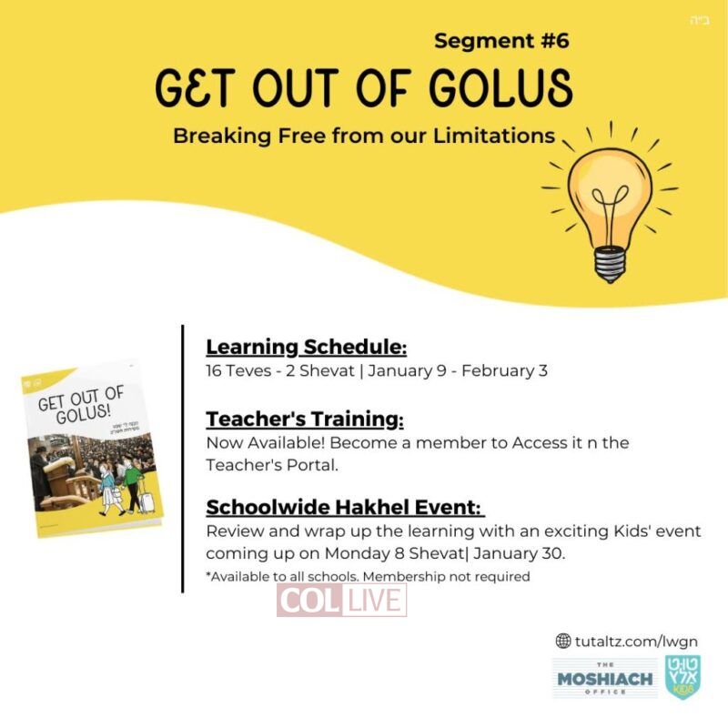 The next Kids Hakhel Event will be available from Monday 8 Shevat – January 30th, reviewing Segment #6: Get Out of Golus. The booklet is available here for free download or on our website: www.tutaltz.com/lwgn.